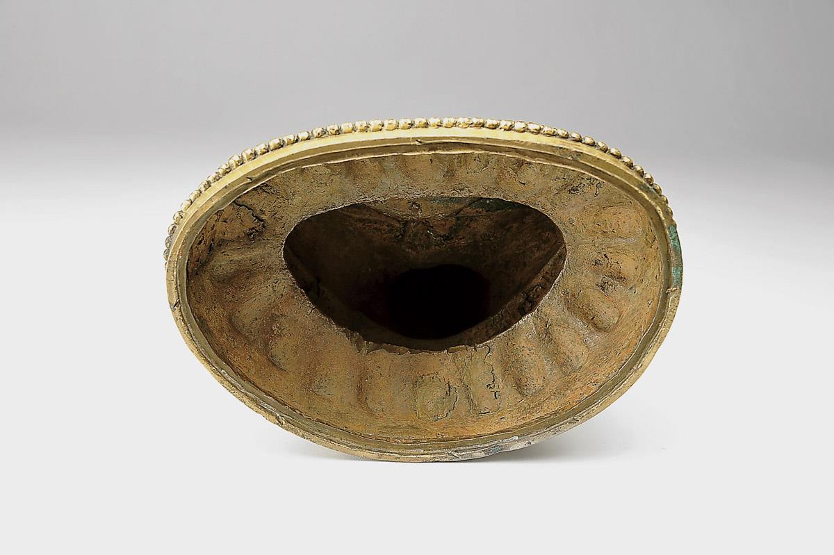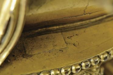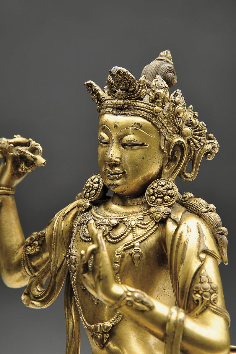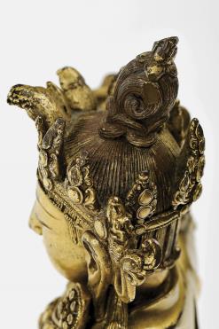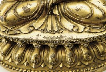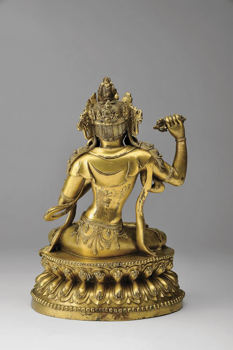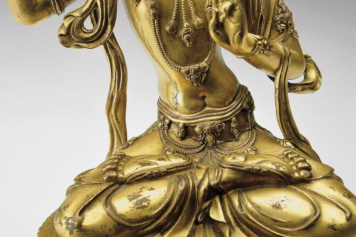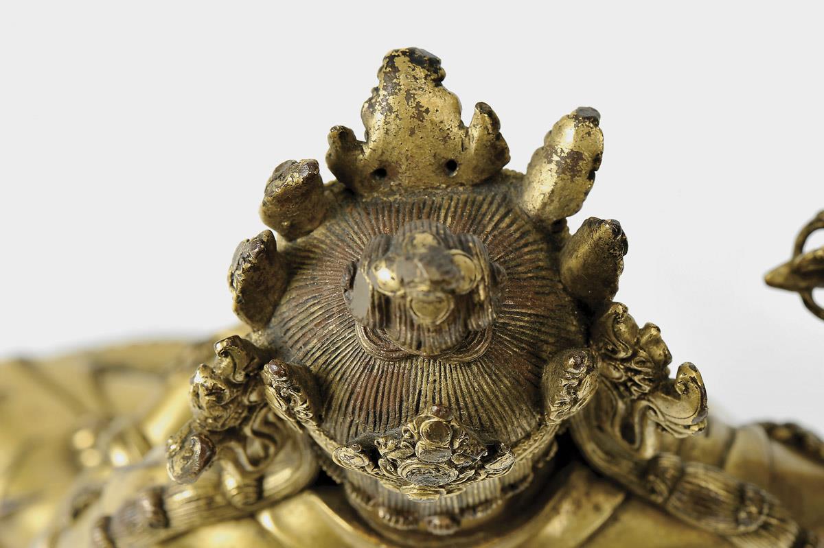 - falta de uma das extremidades do atributo "vajra", dois florões do diadema amolgados, fissuras e pequenos defeitos de fundição, ligeiro desgaste no dourado