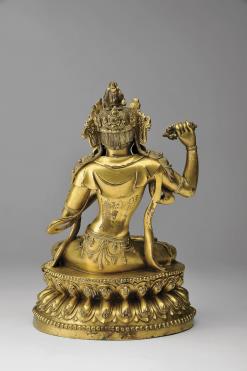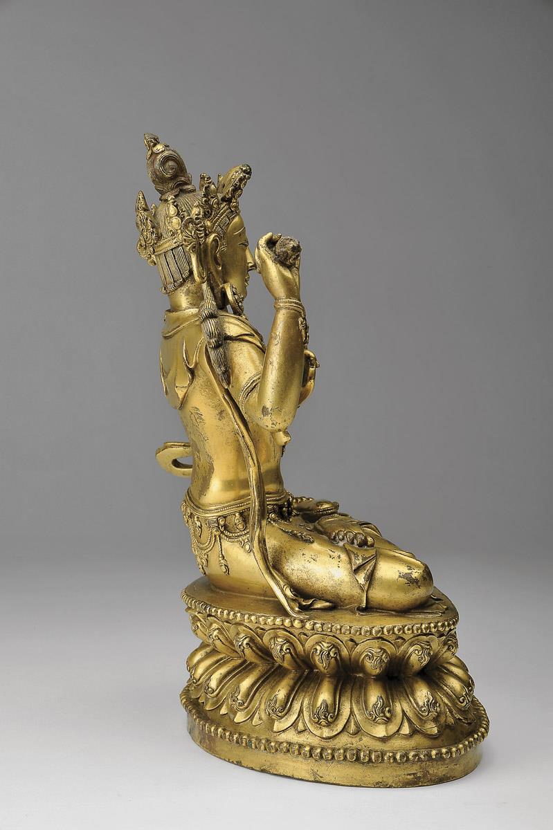 - O "Bodhisattva" está sentado na posição "dhyanasana" sobre uma base de duplo lótus, a mão direita levantada em posição vajra mudra" (gesto de conhecimento) com o dedo indicador e o dedo mínimo apontando para cima, segurando o "vajra", a mão esquerda em posição "vitarka mudra" (gesto de discussão e transmissão do ensinamento Budista).