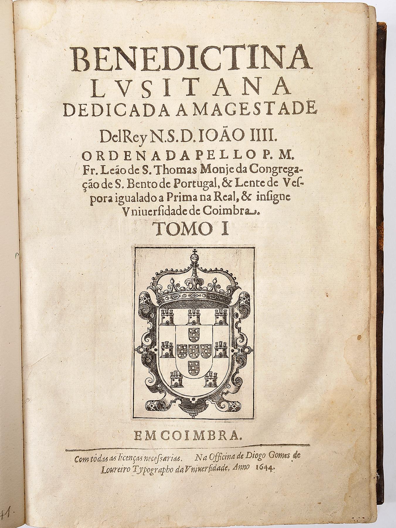 - SÃO TOMÁS, Frei Leão de.- BENEDICTINA | LVSITANA. | DEDICADA AO GRANDE | Patriarcha S. Bento. | ORDENADA PELLO P. M. | Fey Leão de S. Thomas Monje da Congrega- | ção de S. Bento de Portugal, & Lente de Ves- | pora igualado a Prima na Real, & insigne | Vniuersidade de Coimbra.- Em Coimbra: Na Officina de Diogo Gomes de Loureiro, 1644-1651.- 2 vols.: 1 retrato; 26 cm.- E. Segundo Inocêncio (V, p. 170) é obra de grande erudição e o seu autor denuncia grandes estudos e profundo conhecimento das coisas antigas. Os dois tomos apresentam a seguinte colação: I - [8], 566, [38] p.; II - [8], 519, [1] p. O primeiro tomo apresenta um belo retrato de S. Bento, gravado a talhe-doce (no verso terceiro fólio). O segundo tomo, impresso por Manuel de Carvalho, inclui um catálogo alfabético das armas da nobreza do reino, compreendendo 310 famílias. Exemplar levemente aparado, com alguma acidez, mas completo e sólido, conservando o raro retrato. Encadernações do século XX, Inteiras de carneira, levemente cansadas, com casas fechadas a ouro nas lombadas. Samodães, 3107.