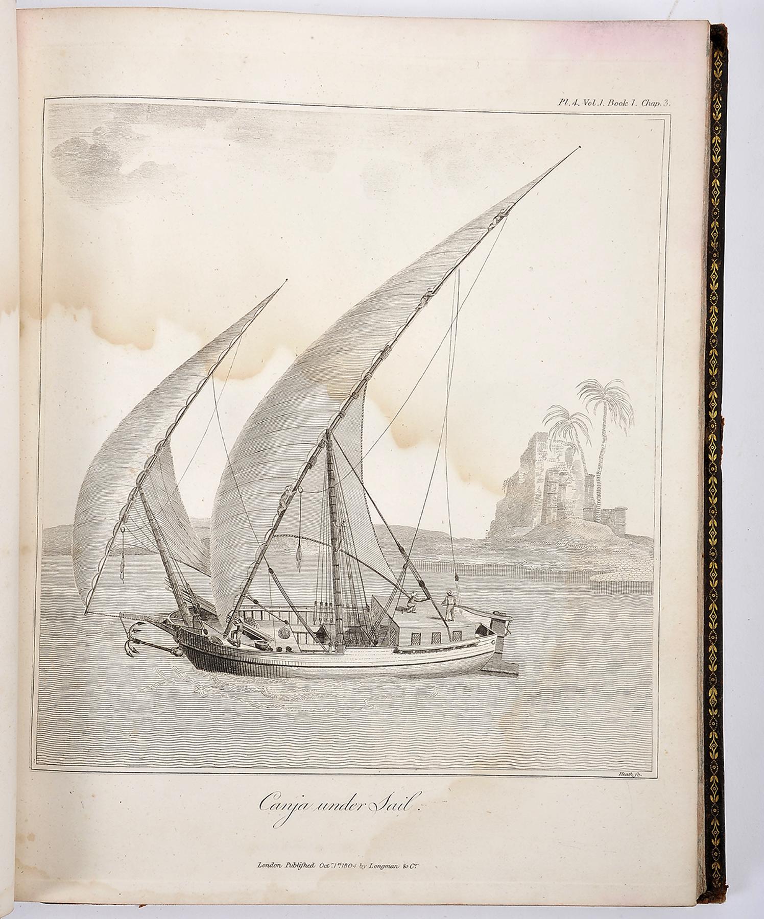 - BRUCE, James.- Travels to discover the source of the Nile, in the years 1768, 1769, 1770, 1772, & 1773.- Vol. VIII. containing the plates and maps.- The second edition, corrected and enlarged to which is prefixed a life of the author.- Edinburgh: Printed by James Ballantyne, 1805.- 16 p.: 19, 3, 57 gravuras, 3 mapas desdobráveis; 30 cm.- E. James Bruce (1730-1794), escritor, viajante e explorador escocês que permaneceu cerca de 12 anos em África reclamando para si a descoberta das nascentes do Nilo, em deterimento de outros viajantes, nomeadamente do missionário jesuíta português Jerónimo Lobo (1595-1678). Oitavo e mais procurado tomo da segunda edição de uma obra clássica, constituída por sete tomos, dos quais este é o último e inclui todas as 79 gravuras e 3 mapas desdobráveis dos restantes seis. Exemplar com manchas de água (de maré) que afectam todas as gravuras, mapas e folhas de texto, com maior ou menor intensidade. Encontra-se contudo completo e sólido, conferindo pelo respectivo índice. Ex-libris heráldico inglês: Earl of Rosebery. Encadernação inteira de carneira, da época, cansada.