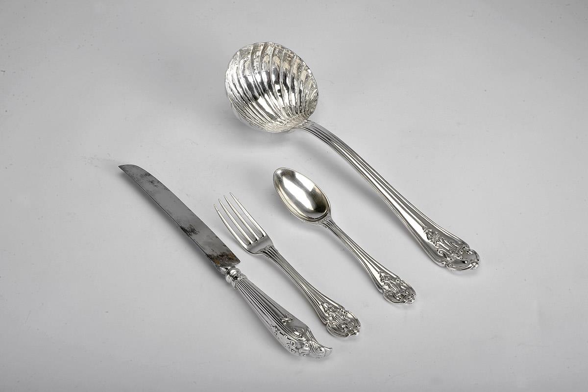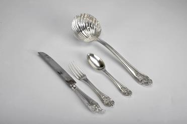 - ferragens em bronze com resto de dourado, interior revestido a veludo vermelho com galões contendo faqueiro para doze pessoas, prata, decoração relevada "Concheados e bicos de ave", composto por concha e colheres de sopa e talheres de resto