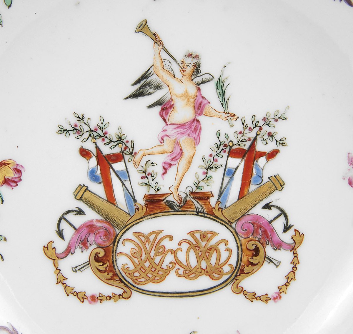 - decoração policromada e dourada "Alegoria à Fama e à Paz, bandeiras holandesas, troféu e dois monogramas"