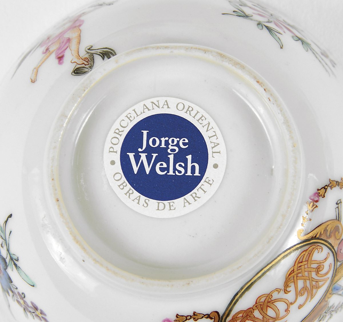 - uma taça com pequeno cabelo e pequena esbeiçadela restaurada, fundos com etiquetas JORGE WELSH - PORCELANA ORIENTAL - OBRAS DE ARTE
