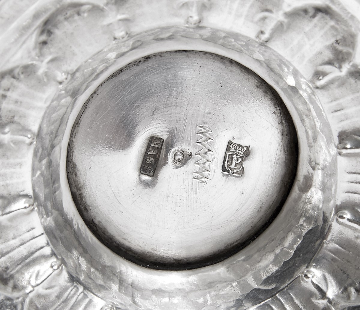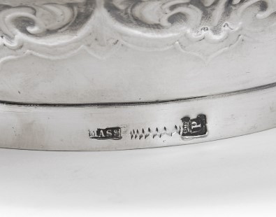 - composto por bule, cafeteira, açucareiro, leiteira, manteigueira e taça de pingos, decoração relevada "Folhagens", marca de ensaiador do Porto (1877-1881), marca de ourives de Manuel António dos Santos Silva (1870-1886)