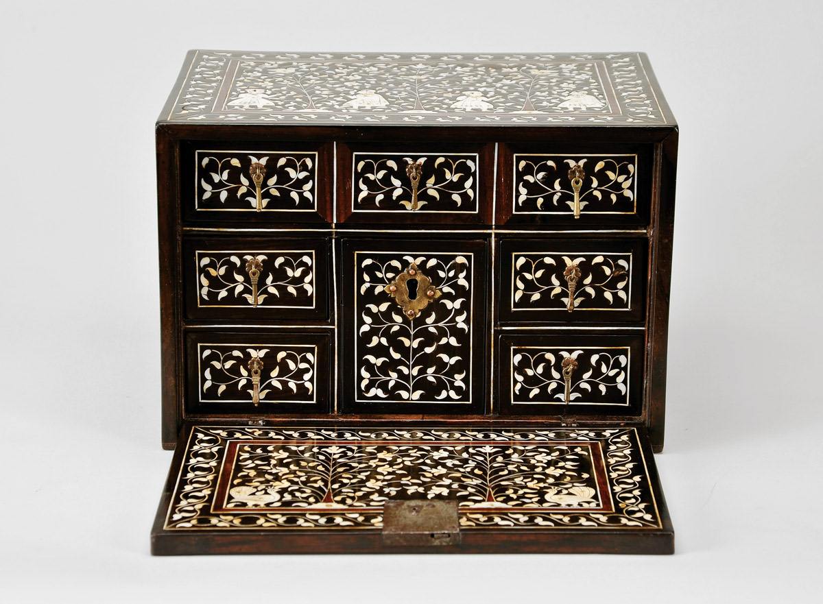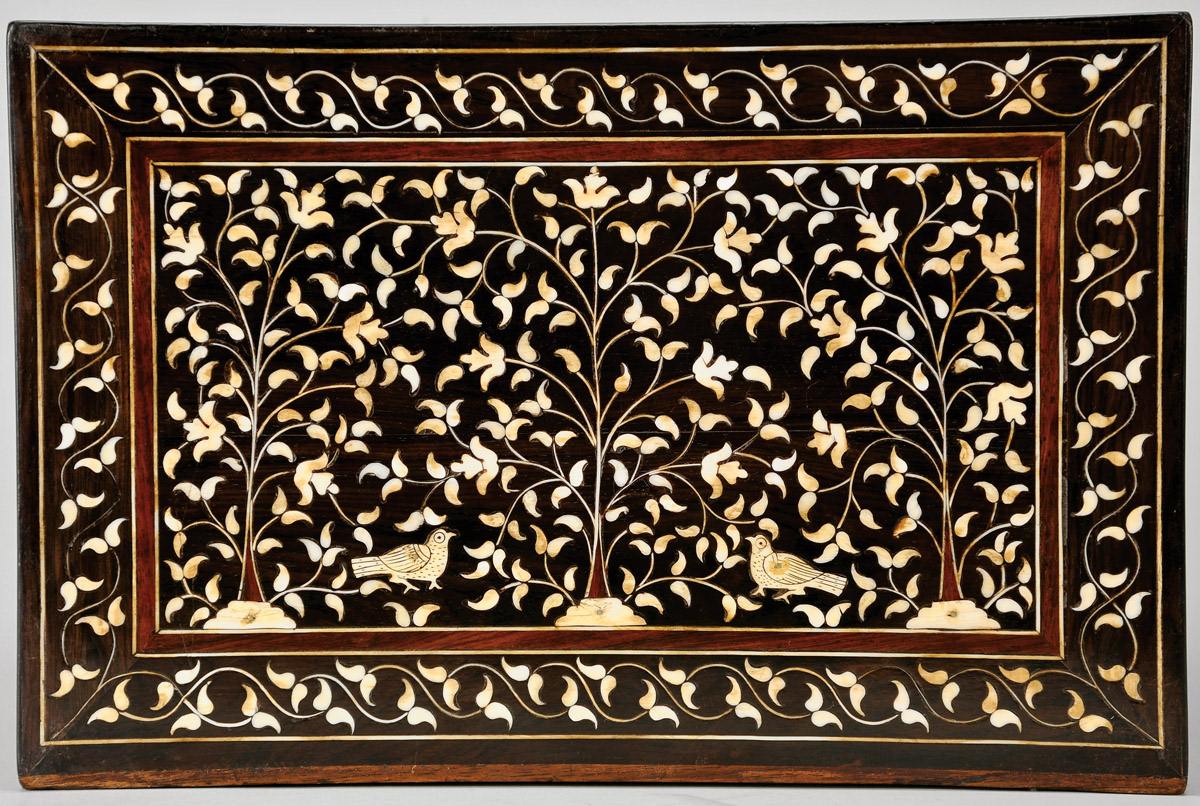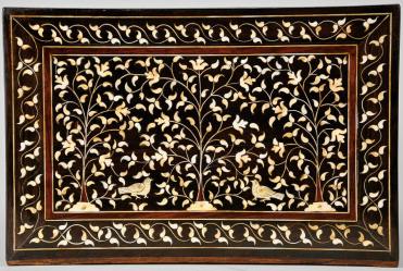 - revestimento integral a marchetaria de ébano e marfim "Figuras da Corte Mogol, caçador armado com arco e flecha, persegue um leão e lebre , Árvore da Vida, pavões e pássaros", marfim fixado com pinos de metal dourado, ferragens em metal dourado