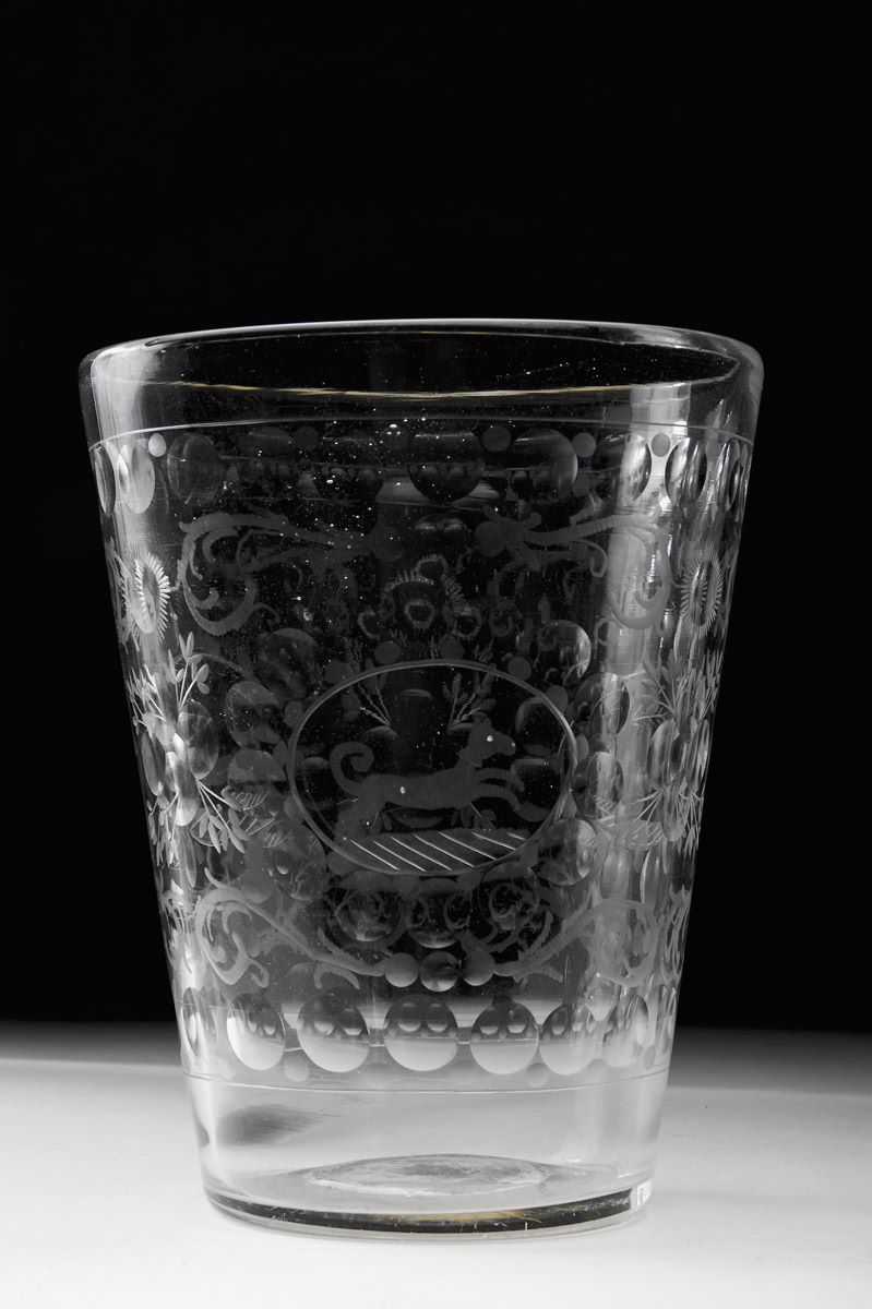 - decoração lapidada e gravada "Veado, corça, cão e flores"