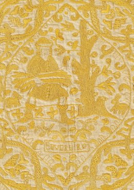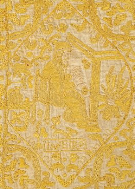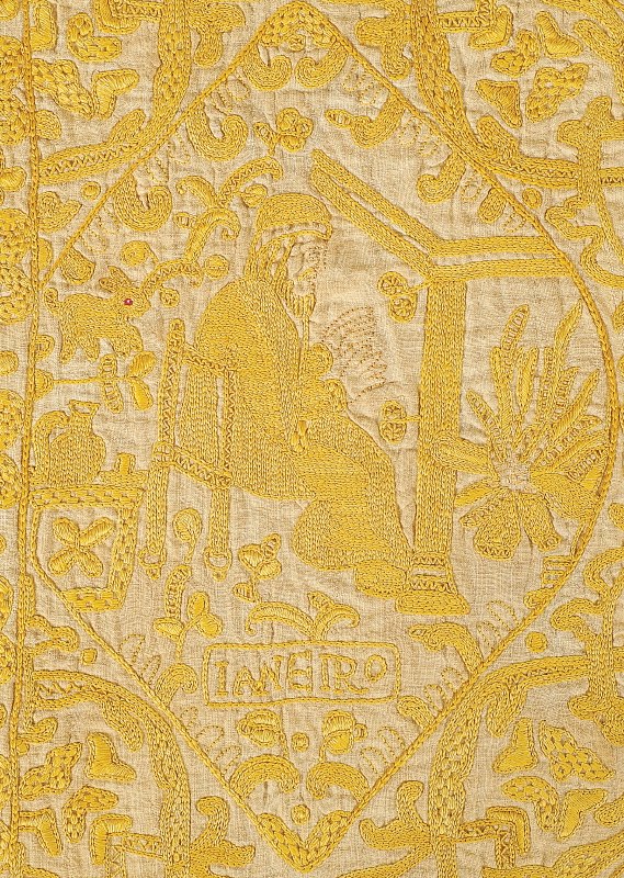 - painel central com dezassete reservas entre motivos vegetais e animais diversos: a central apresentando "Cavaleiro português"; doze apresentando "Meses do Ano"; duas apresentando "Figuras tocando instrumentos musicais"; e as restantes duas apresentando "Figuras segurando flores". Cercadura apresentando nos quatro cantos "Tempo", "Ocasião", Fortuna" e "Fama"; e nas faixas "Aves"