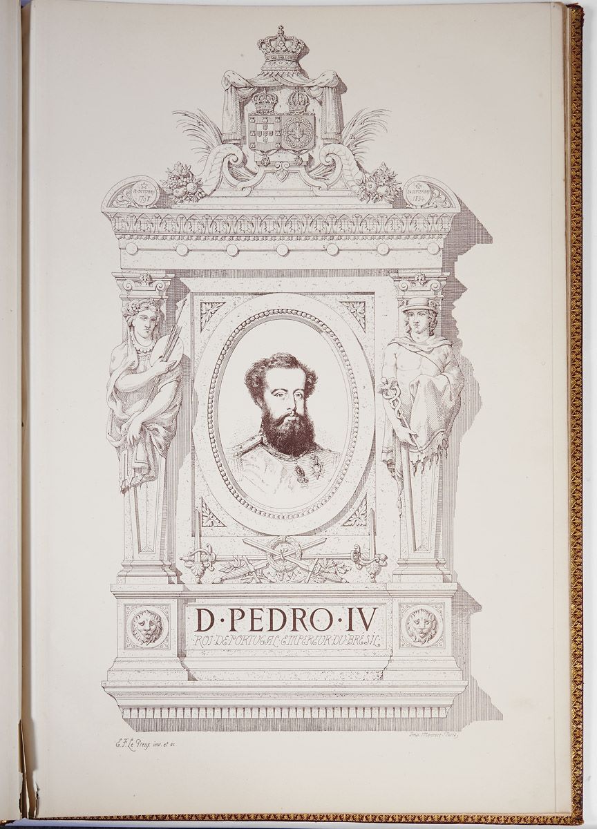 - LE PREUX, E. F.- Monument érigé a Lisbonne a la Gloire Immortelle de Sa Majesté Don Pedro IV Roi de Portugal, Empreur du Brésil. Résumé historique du Concours International ouvert pour ce monument, reproduction des remarquables projets qui y furent présentés, et portrait de ce souverain. D’après les documents officiels du Gouvernement Portugais / texte et dessins par E.-F. Le Preux; notice biographique par le Baron Édouard de Septenville.- Paris: Chez Monrocq Frères, 1875.- [2], 2, 4, 11 f. litografadas, 1 retrato; 54 cm.- E.