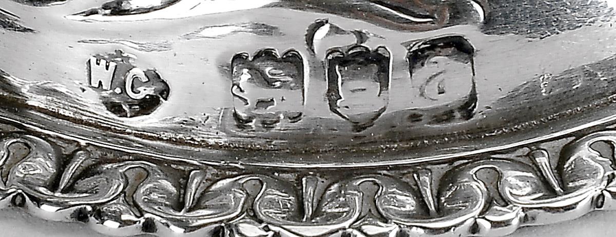 - decoração relevada "Anjos", marca da cidade de Londres (1896-1897), marca de ourives de WG