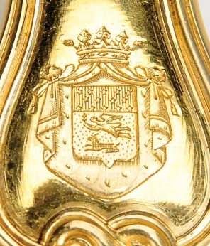 - Part of a Flatware service,◙gilt silver,◙comprising 2 serving spoons, 18 soup spoons, 36 knifes and 18 forks, engraved with family coat of arms, Paris assay marks, French
