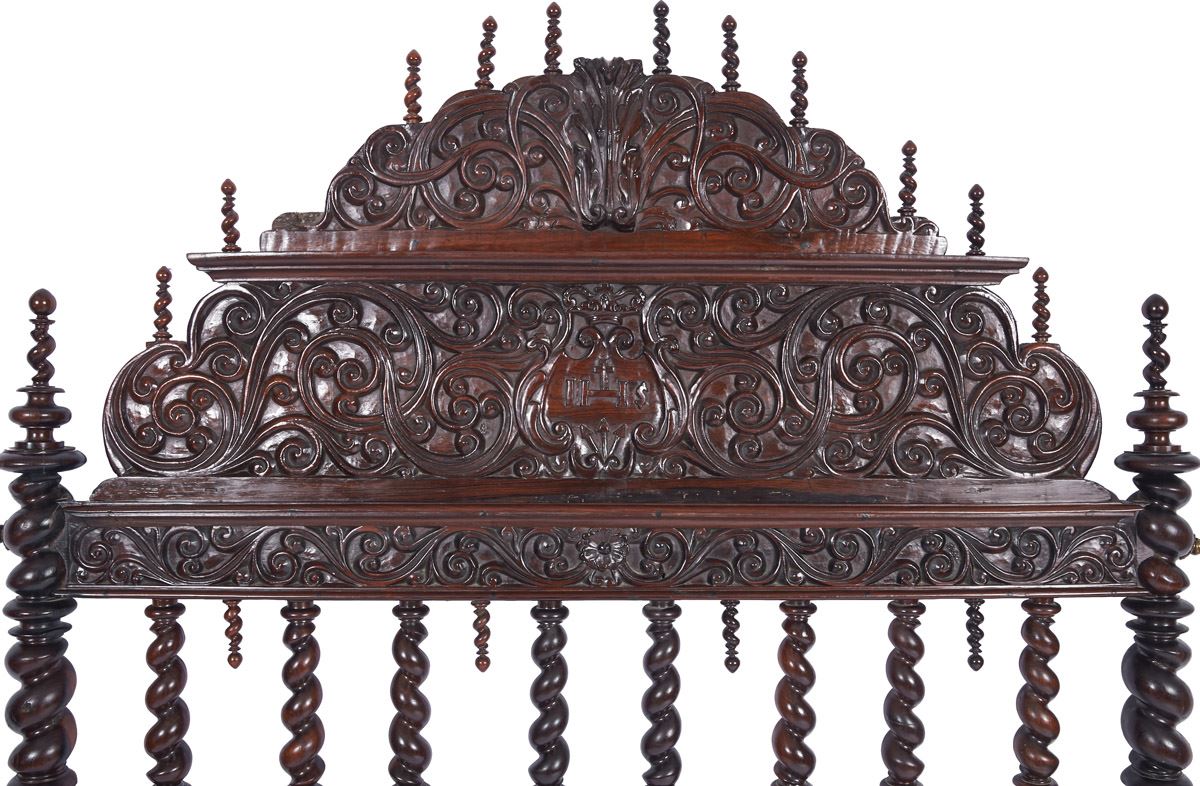 - espaldar com inscrição "IHS", pernas e colunas torneadas