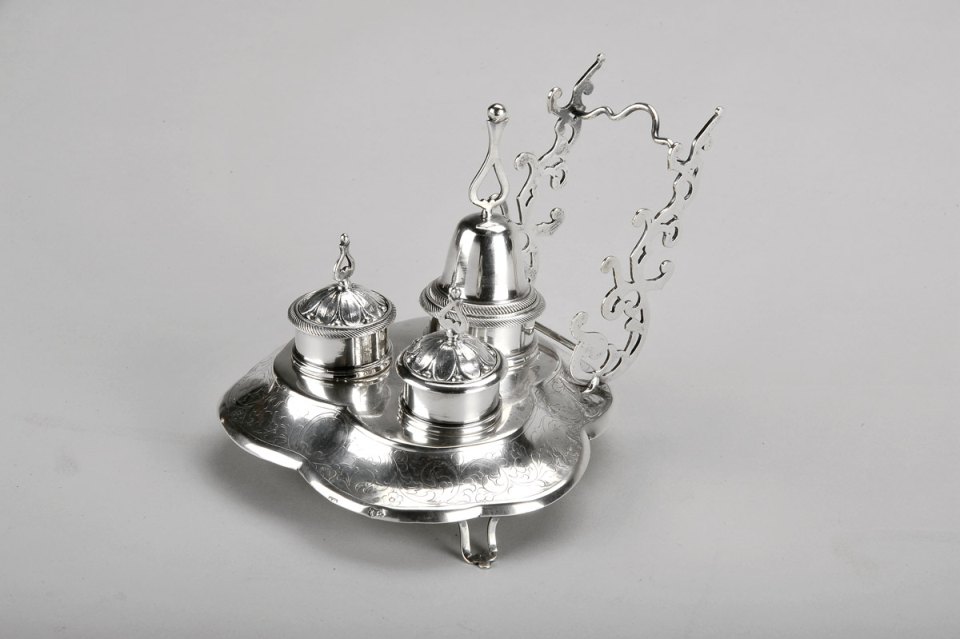 - composto por suporte para caneta, campainha, tinteiro e areeiro, marca de ensaiador do Porto (1861-1867), marca de ourives MJG (1861-1867)