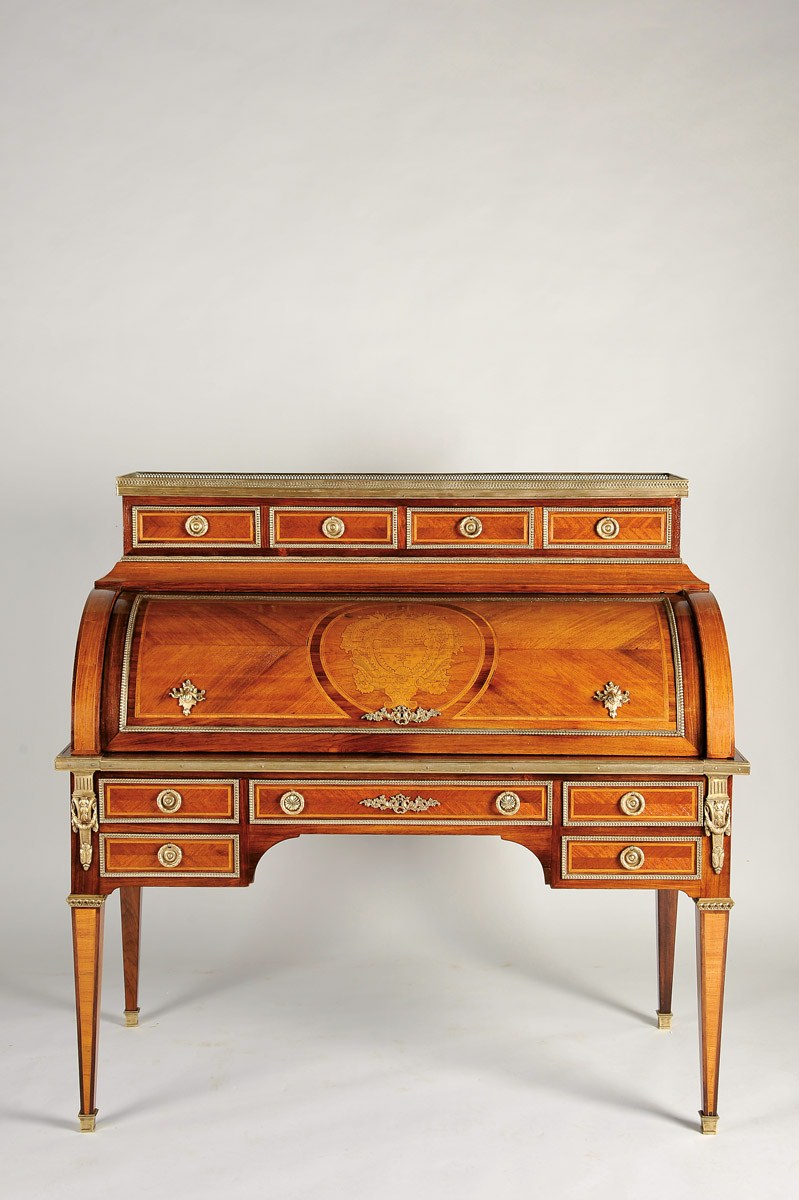 - exemplar semelhante encontra-se representado em "Les styles français - Le Mobilier", Éditions Plaisir de France, Paris, 1964, p. 76, nº 3.◙◙A Bureau Cylindre,◙Louis XVI style,◙wood veneered in Brasilian rosewood with inlaid and fillets "Coat of Arms of Fr