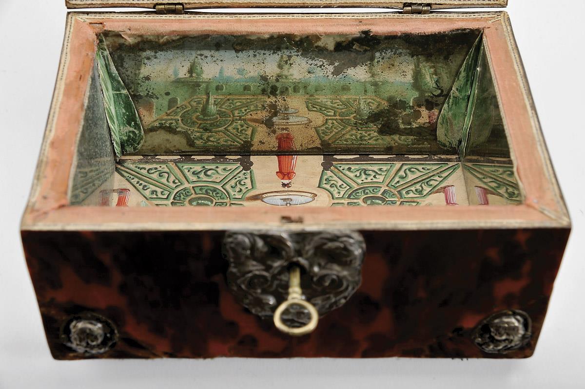 - aplicações em prata relevada "Bustos femininos" e "Bustos masculinos", interior com fundo pintado "Jardim" virado para o interior da face posterior do cofre onde está colodado um espelho para reflectir o "Jardim" direito ao abrir da tampa.