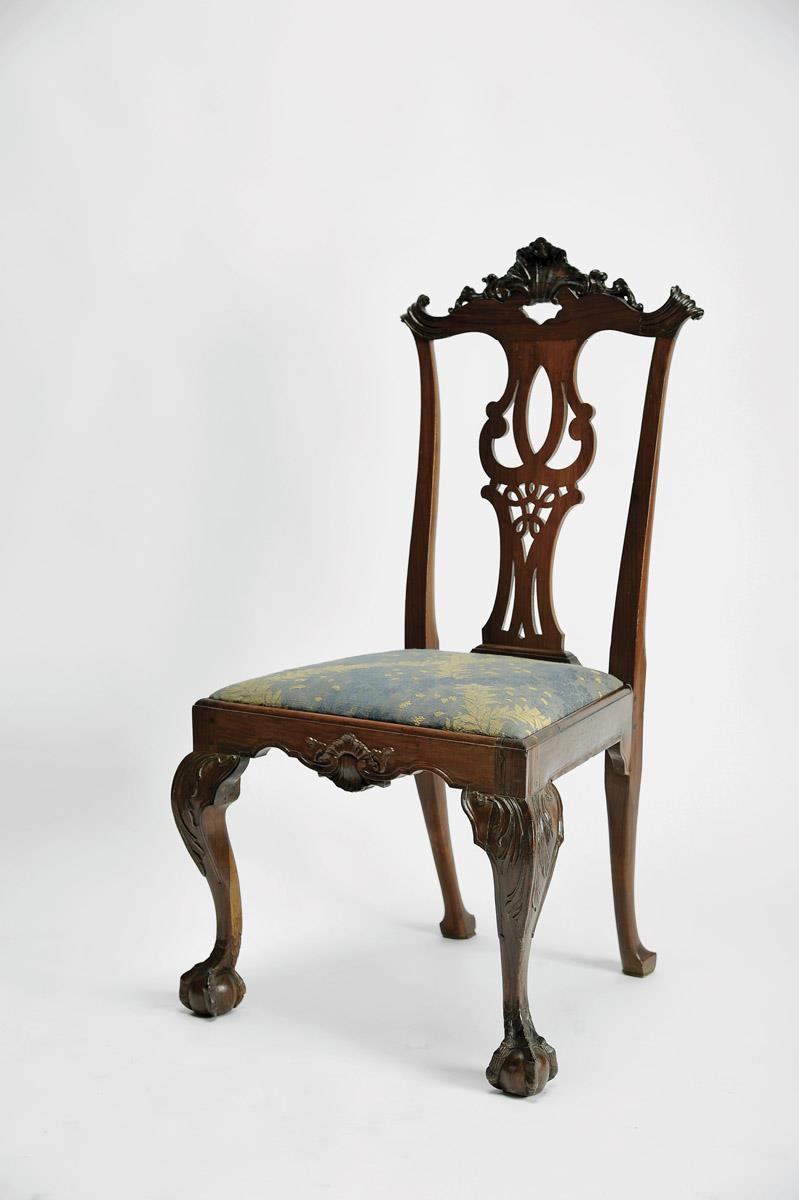 - tabelas recortadas e vazadas, pés de "Garra e bola", assentos estofados