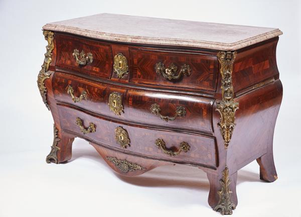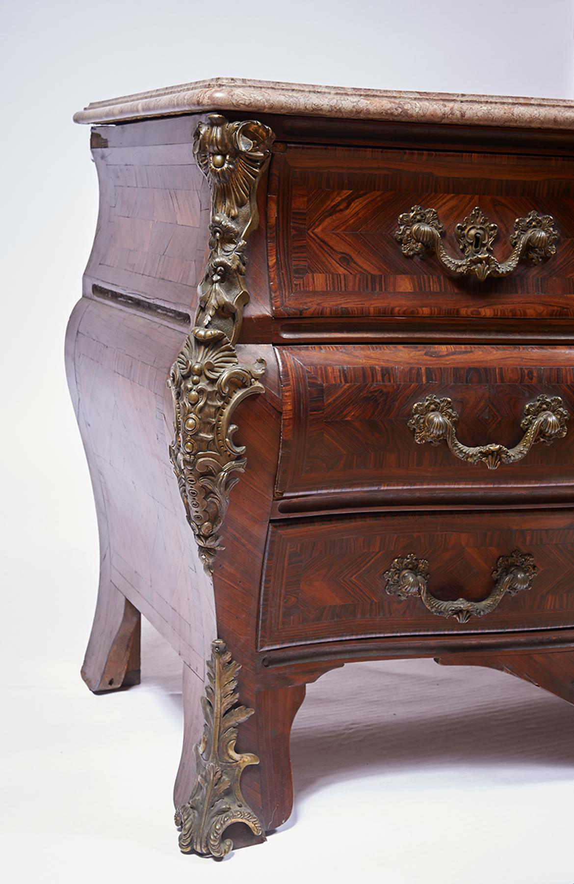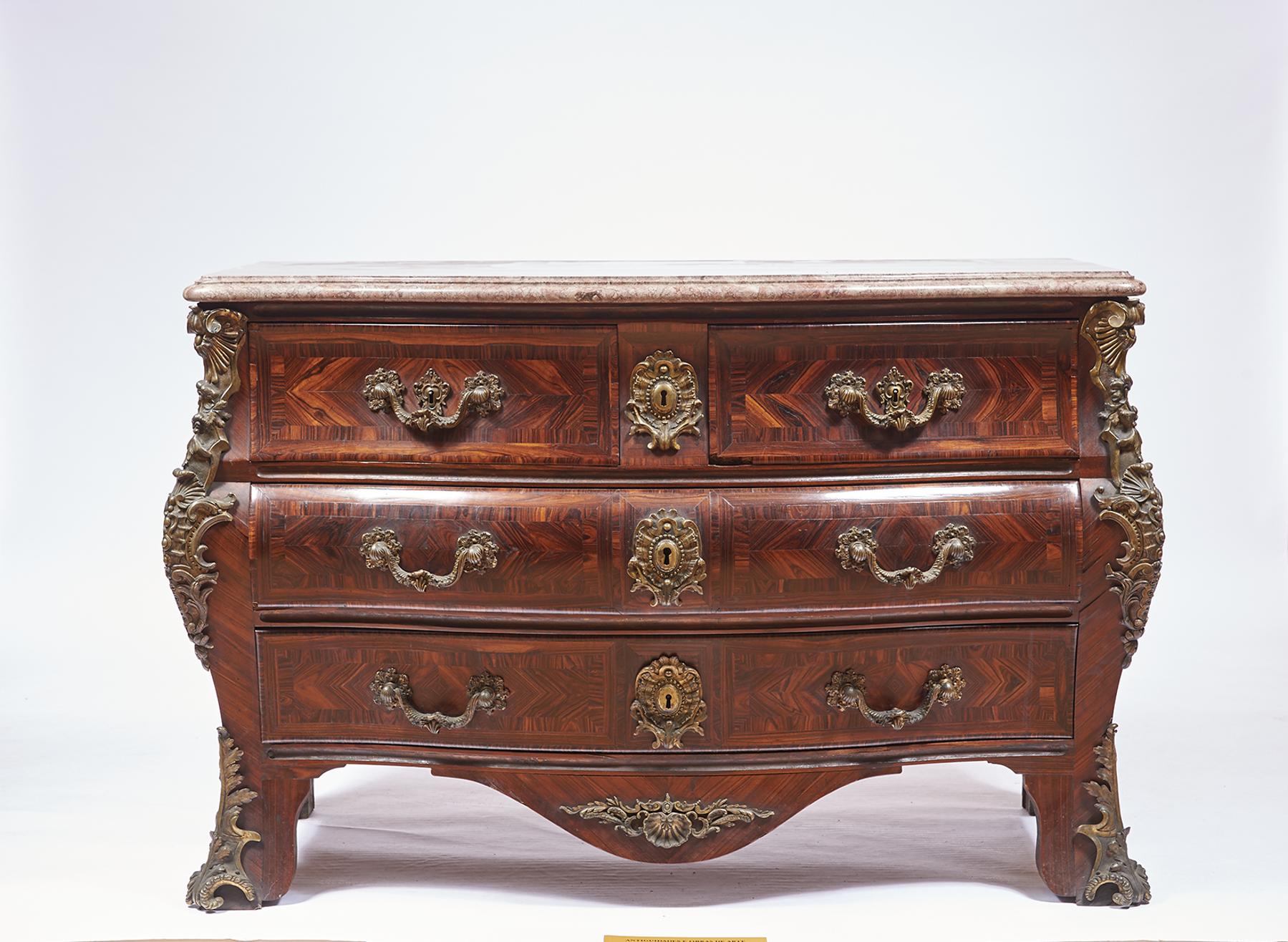 - interiores em casquinha e carvalho, tampos de lioz, aplicações e puxadores em bronze relevado