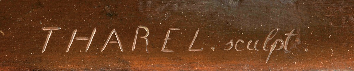 - vd. KJELLBERG, Pierre - "Les Bronzes du XIX Siècle - Dictionnaire des Sculpteurs", Les Éditions de l'Amateur, Paris, 1987, p. 624.◙◙LÉON THAREL - 1858-1902,◙"Musician boy", bronze sculpture, unoriginal velvet base studded with nails, signed, SUSSE founder