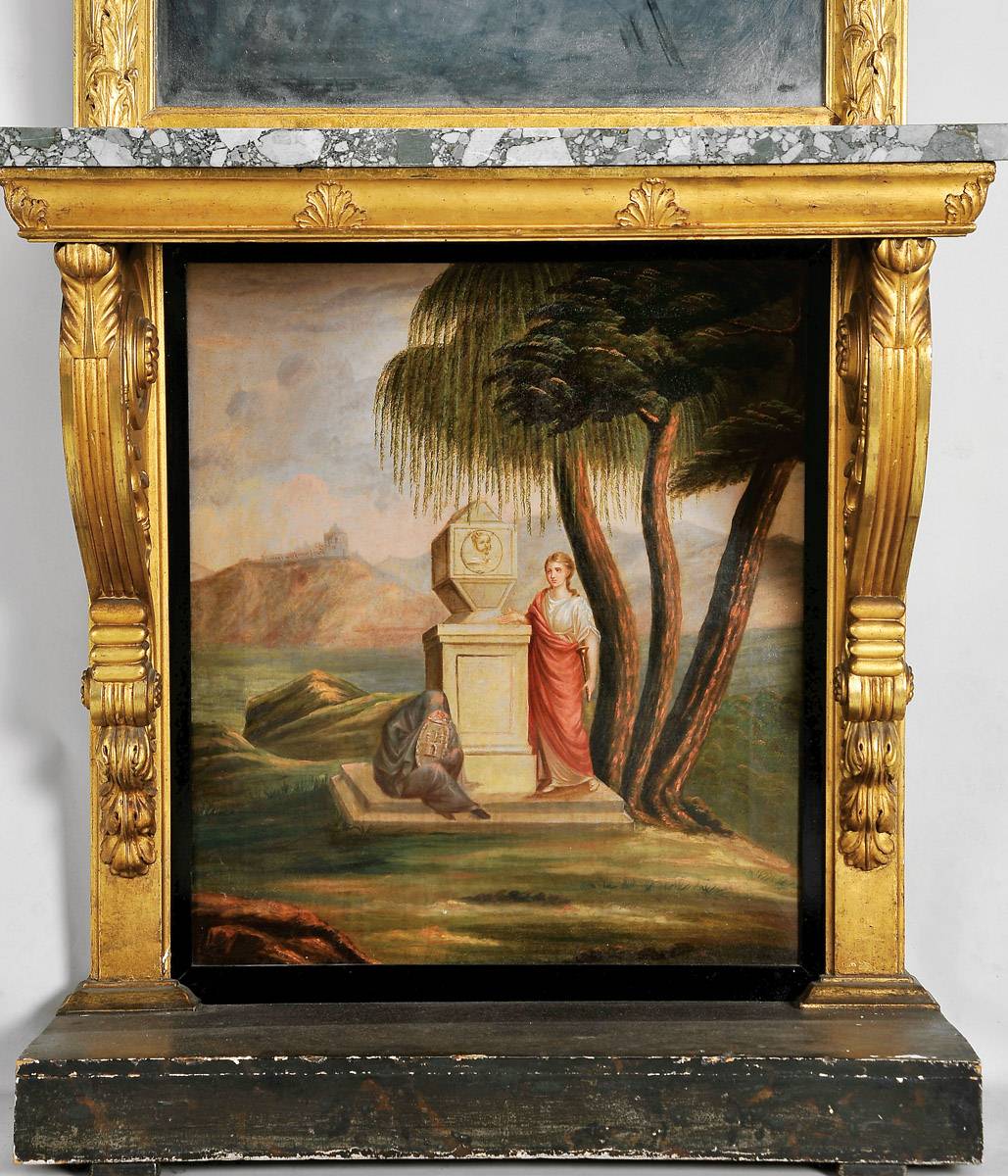 - parte inferior com óleo sobre tela "Alegoria a D. Pedro IV e à Cidade do Porto", parte superior com espelho, tampo em mármore cinzento