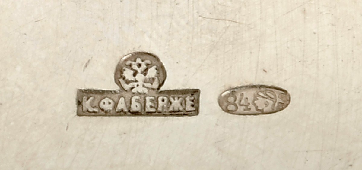 - marca de teor de 84 zlotnicks, marca de ensaiador de Kazan de Ivan Ado (1899-1908), marca da ourivesaria de Peter Karl Fabergé (1846-1920)