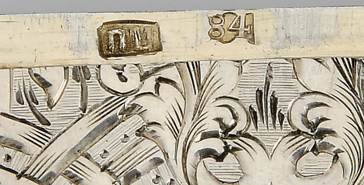- decoração gravada e guilhochada, marca de ensaiador da cidade de Moscovo de Andrei Kovalsky (1851), marca de ourives de Pavel Volkol (1869-1908)
