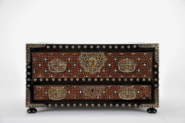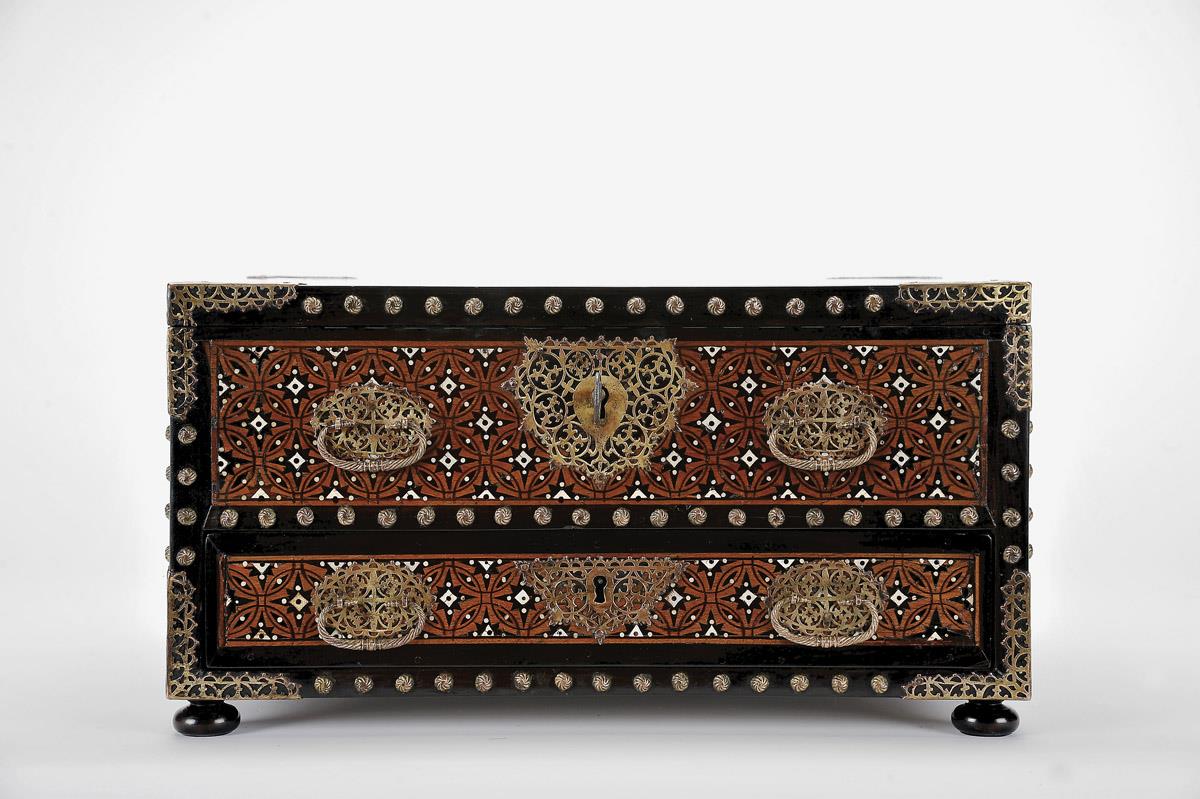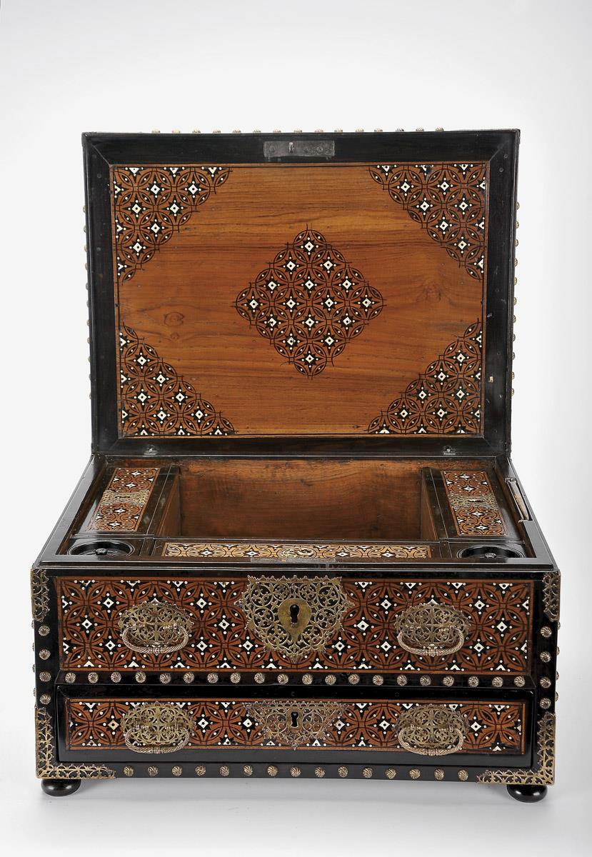 - revestimento parcial a ébano, embutidos em ébano e marfim "Círculos secantes", ferragens em cobre vazado e dourado, tachas em cobre espiralado e dourado, interior compartimentado com tampas de decoração semelhante e dois receptáculos com tinteiro e areeir