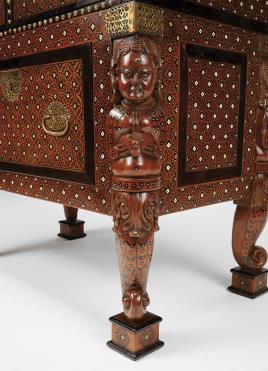 - revestimento parcial a ébano, embutidos de ébano e marfim "Círculos secantes", ferragens em cobre vazado e dourado, tachas de cobre espiralado e dourado, trempe com duas gavetas e gavetão, pernas esculpidas "Nagini"