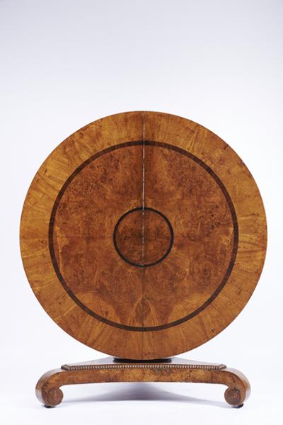 - tampo redondo basculante com marchetaria de carvalho, raiz de nogueira e pau-santo