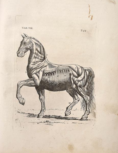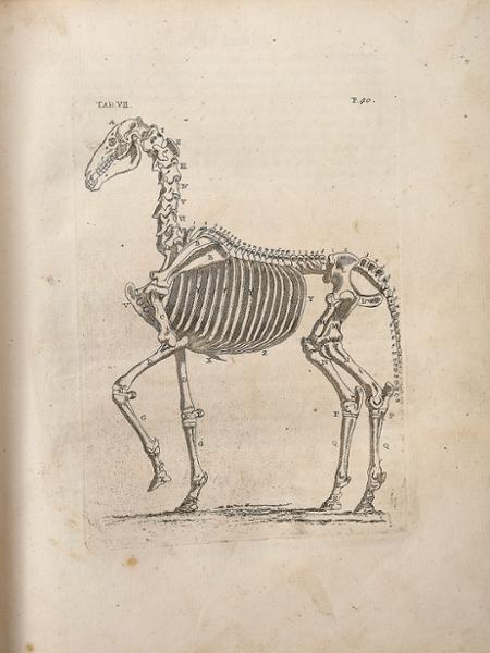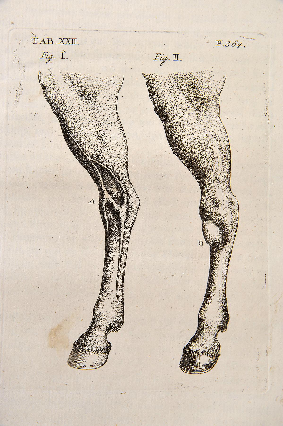 - GIBSON, William.- A new treatise on the diseases of horses: wherein what is necessary to the knowledge of a horse, the cure of his diseases, and other matters relating to that subject, are fully discussed, in a plain and early manner, from many years practice and experience; with the cheapest and most efficacious remedies.- London: Printed for A. Millar, 1751.- [12], 464, [12] p.: 1 frontispício gravado, XXXI gravuras; 27 cm.- E. William Gibson (1680-1750), cirurgião e veterinário, foi autor de quatro das obras mais influentes da época, na história da veterinária de equinos e da profissão de ferrador. Edição original ilustrada com 32 gravuras a talhe-doce, representando aspectos da anatomia do cavalo. Exemplar um pouco manuseado, com falta da gravura VI (Represents the bones of the hind leg and foot, both single and united); gravura III com imperfeições marginais. Algumas anotações manuscritas marginais e ocasionais manchas de tinta. Encadernação inteira de carneira da época, cansada, mas sólida e recuperável.