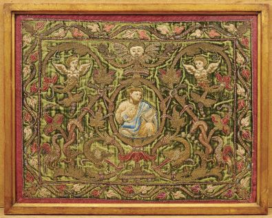 - veludo verde bordado a fio de seda policromado e metal prateado e dourado