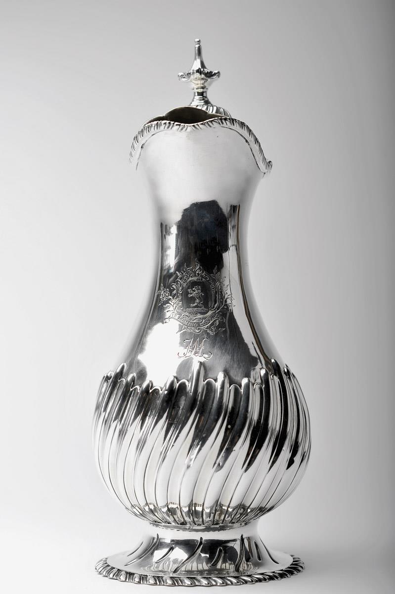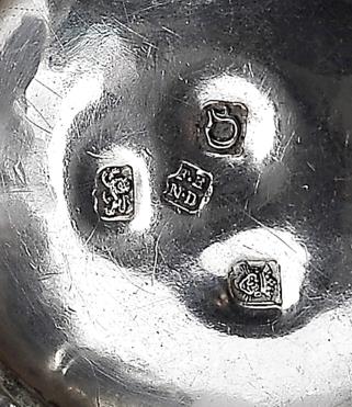 - decoração espiralada, cartela com timbre heráldico "Leão empunhando uma espada", legenda IN DOMINO CONFIDO, monograma com as iniciais JAL, pega em mogno com entalhamentos, marca da cidade de Londres (1769-1770), marca de ourives de Francis Butty & Nichola