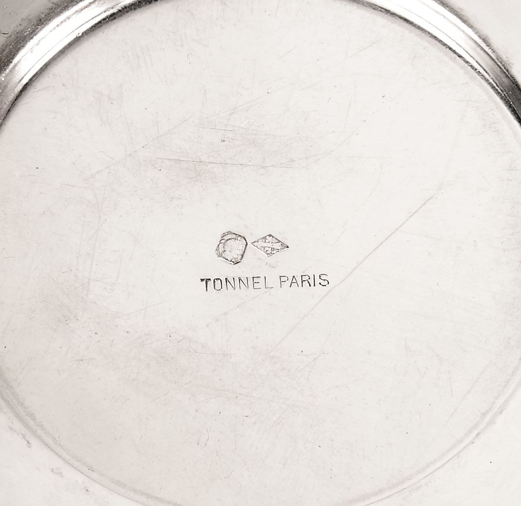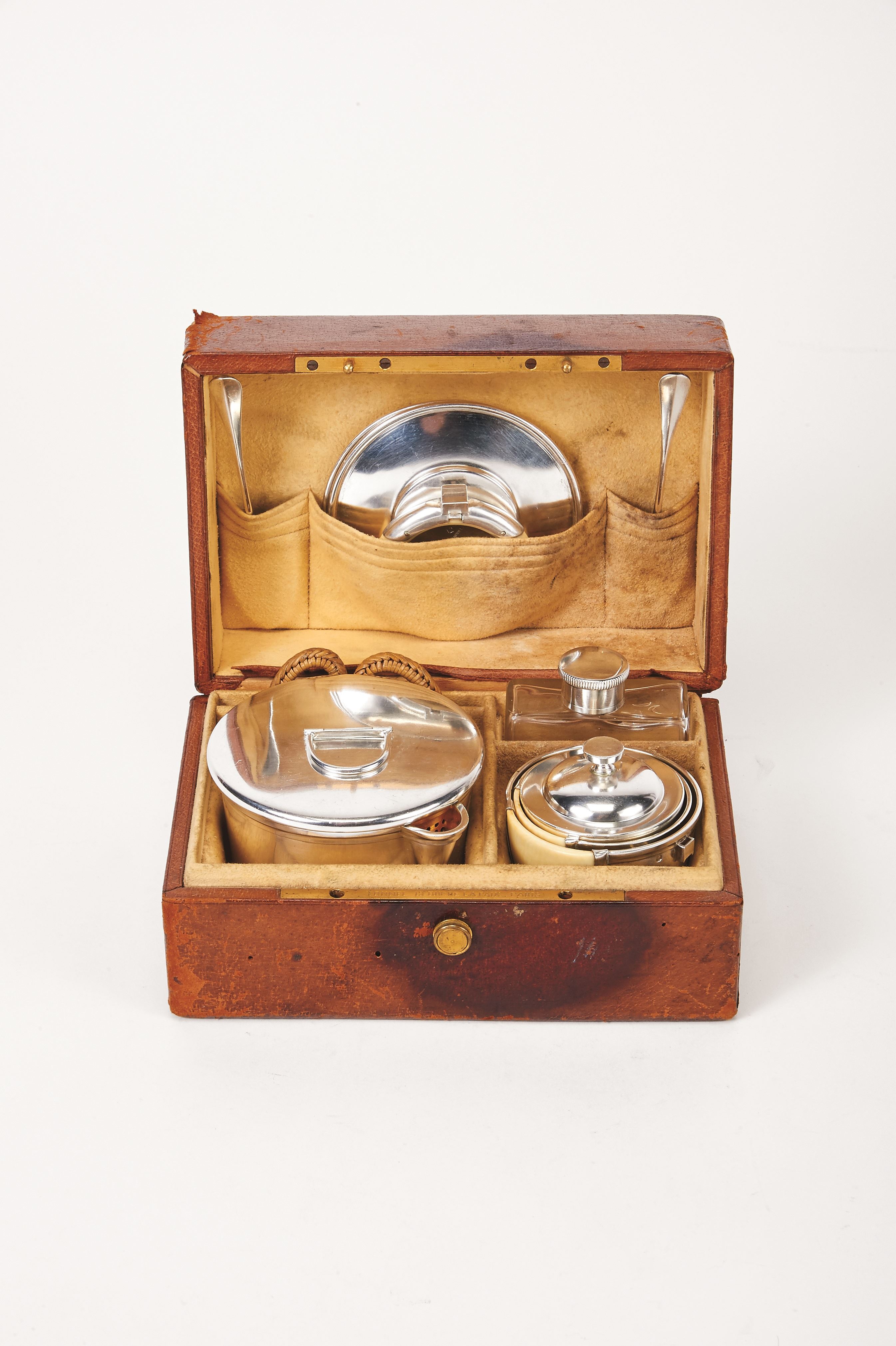 - estojo de viagem em pele castanha, interior com bule de pega amovível e escalfador, 2 caixas, frasco, 2 chávenas com pires e colheres, marca de Paris para o teor de 950/1000, marca de ourives de Jules Marie (1889-1912), algumas peças marcadas TONNEL - PARIS