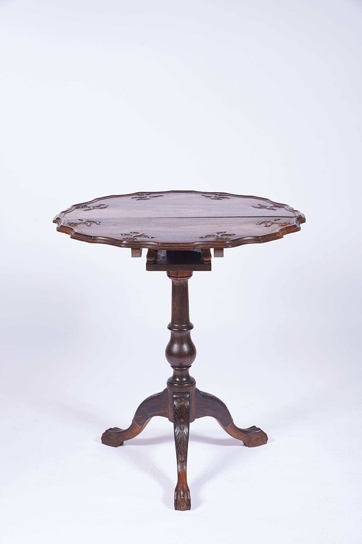 - tampo redondo recortado basculante com entalhamentos "Flores", pés com entalhamentos e extremidades zoomórficas