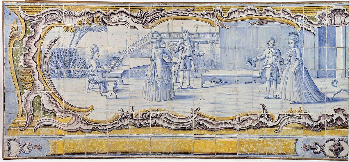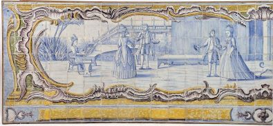 - decoração a azul, cartela rococó a amarelo, verde e vinoso