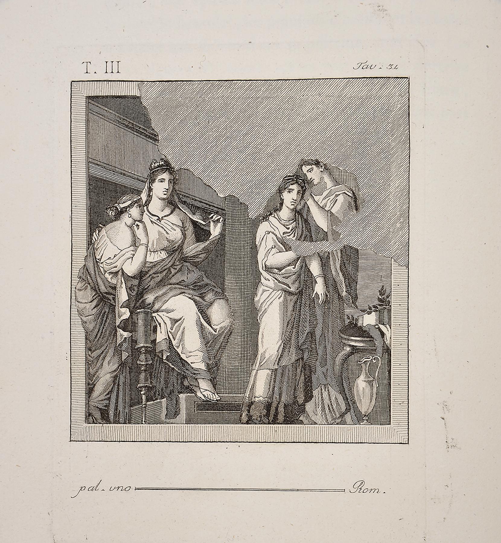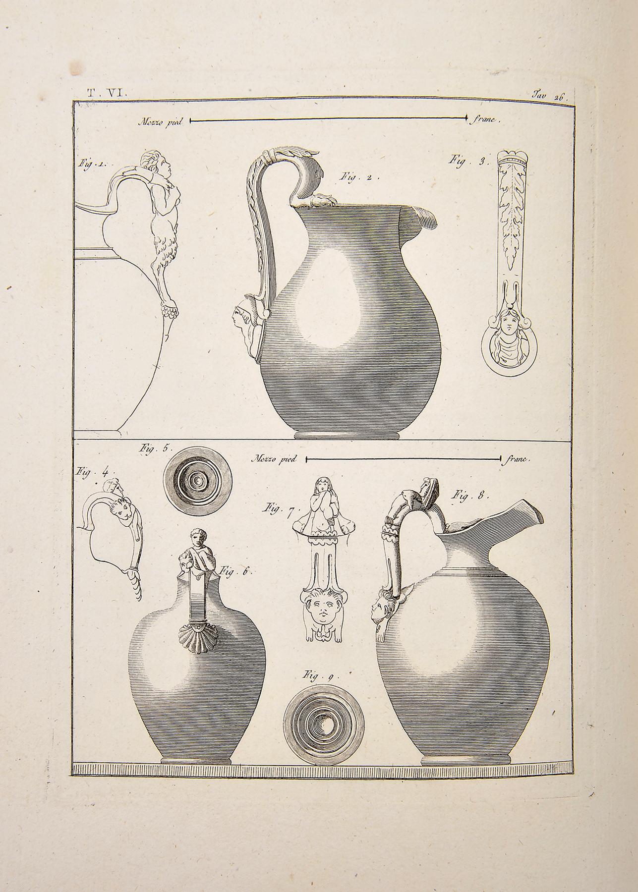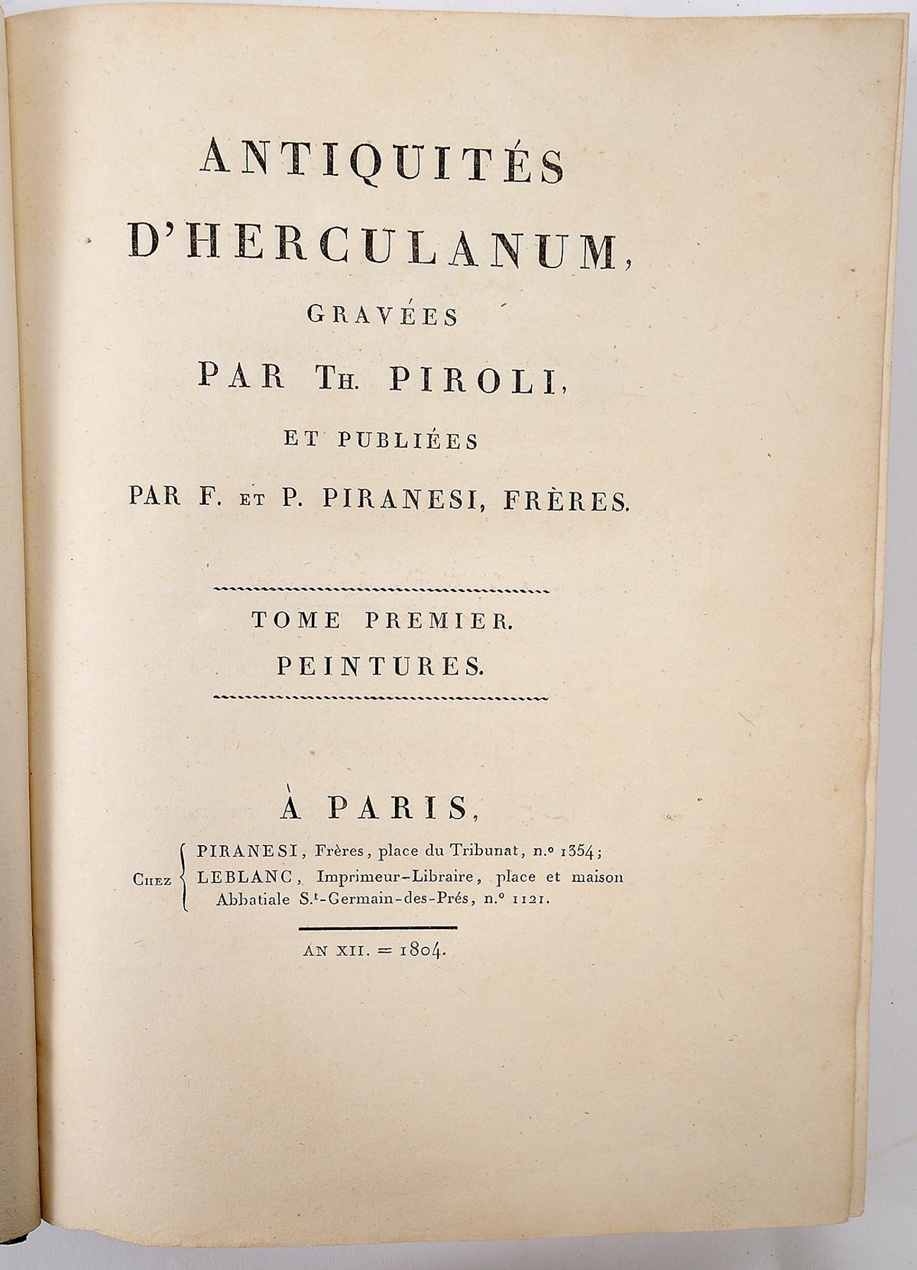 - gravées par Th. Piroli et publiées par F. et P. Piranesi, Frères.- À Paris: Chez Piranesi, Frères, Leblanc, 1804-1806.- 6 tomos em 3 vols.: il.; 29 cm.- E. Edição francesa de uma recolha de antiguidades de Herculano, da autoria do gravador italiano Tommaso Piroli (1750-1824), constando de seis tomos, com a seguinte colação: I (peintures) - [2], VIII p., [48] f.: XLVIII gravuras; II (peintures) - [4] p., [48, 1] f.: XLVIII gravuras; III - (peintures) - [4], 8 p., [60] f.: LX gravuras; IV (bronzes) - [6] p., [48] f.: XLVIII gravuras; V (bronzes) - [6, 2] p., [48] f.: XLVIII gravuras; VI (lampes et candélabres) - VIII, 31, [1 br.] p., [50] f.: L gravuras. Os seis tomos (aqui encadernados em três volumes) integram um total de 302 gravuras a talhe-doce (buril), acompanhadas dos respectivos textos explicativos em folhas intercaladas. Exemplar com falta das gravuras XLIX a LIV no tomo V (6 gravuras), muito limpo (apenas a gravura I do tomo IV, apresenta uma mancha de água), revestido de encadernações da época, com as lombadas em tele e rótulos em pele.