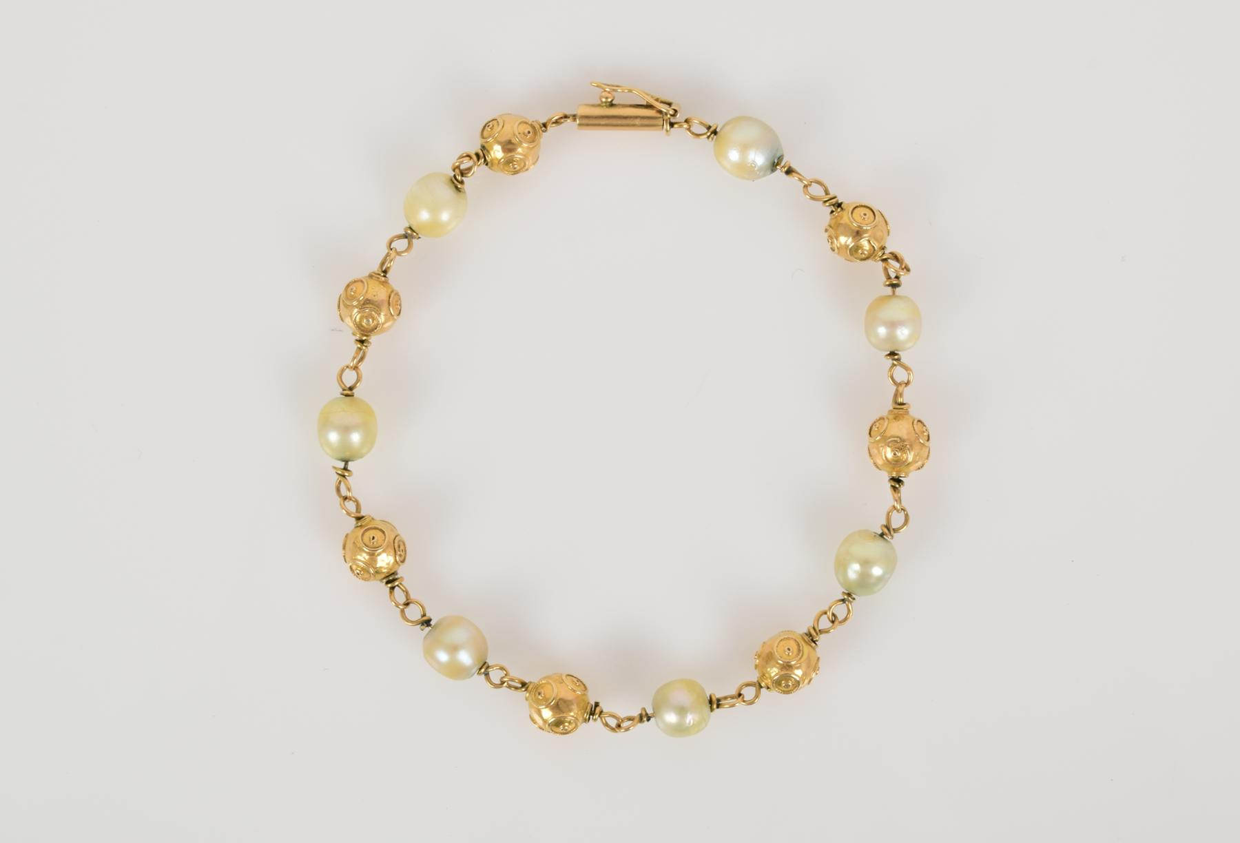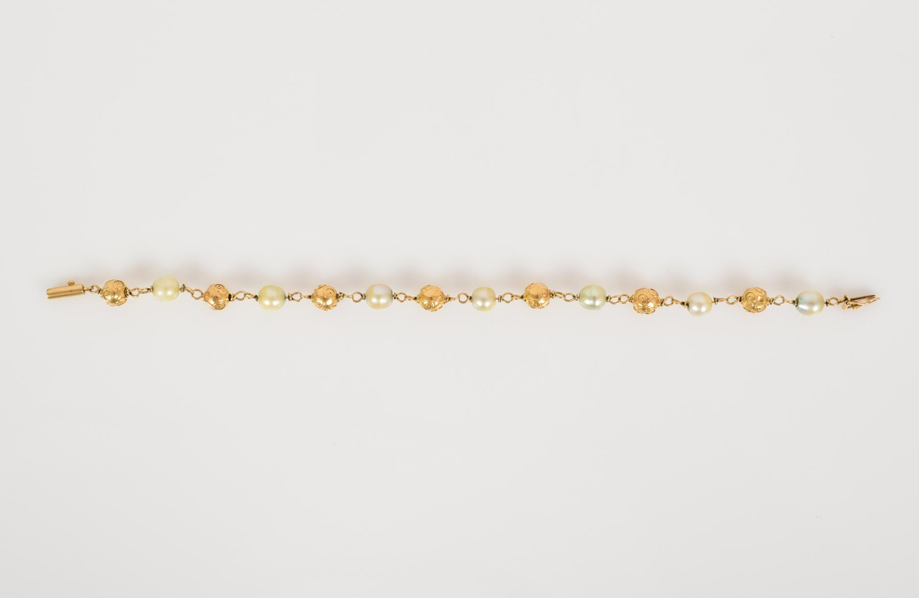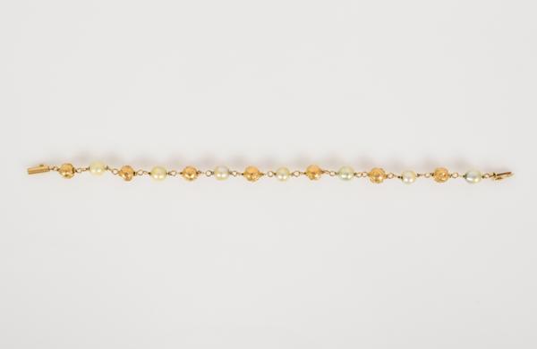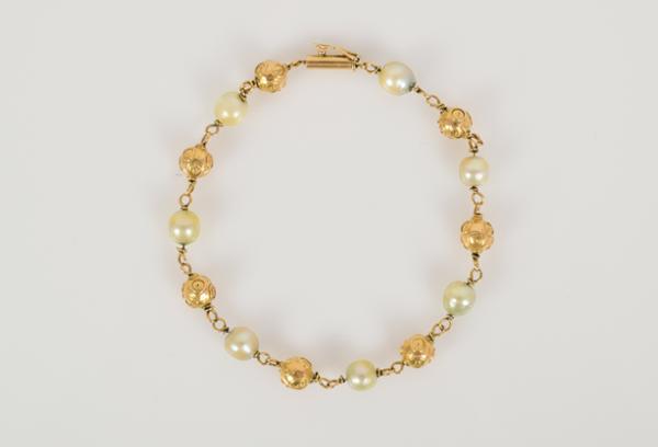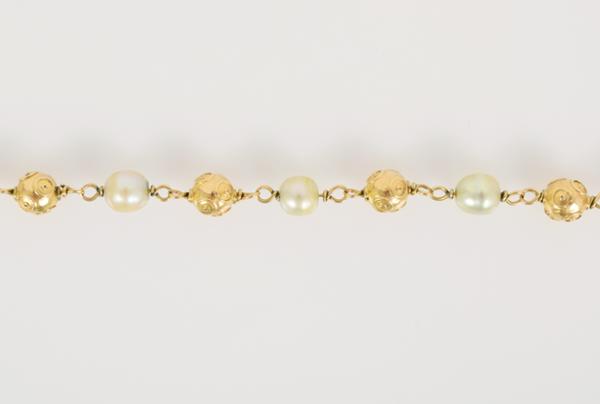- pérolas de cultura engranzadas e intercaladas por contas de Viana em ouro de 800/1000
