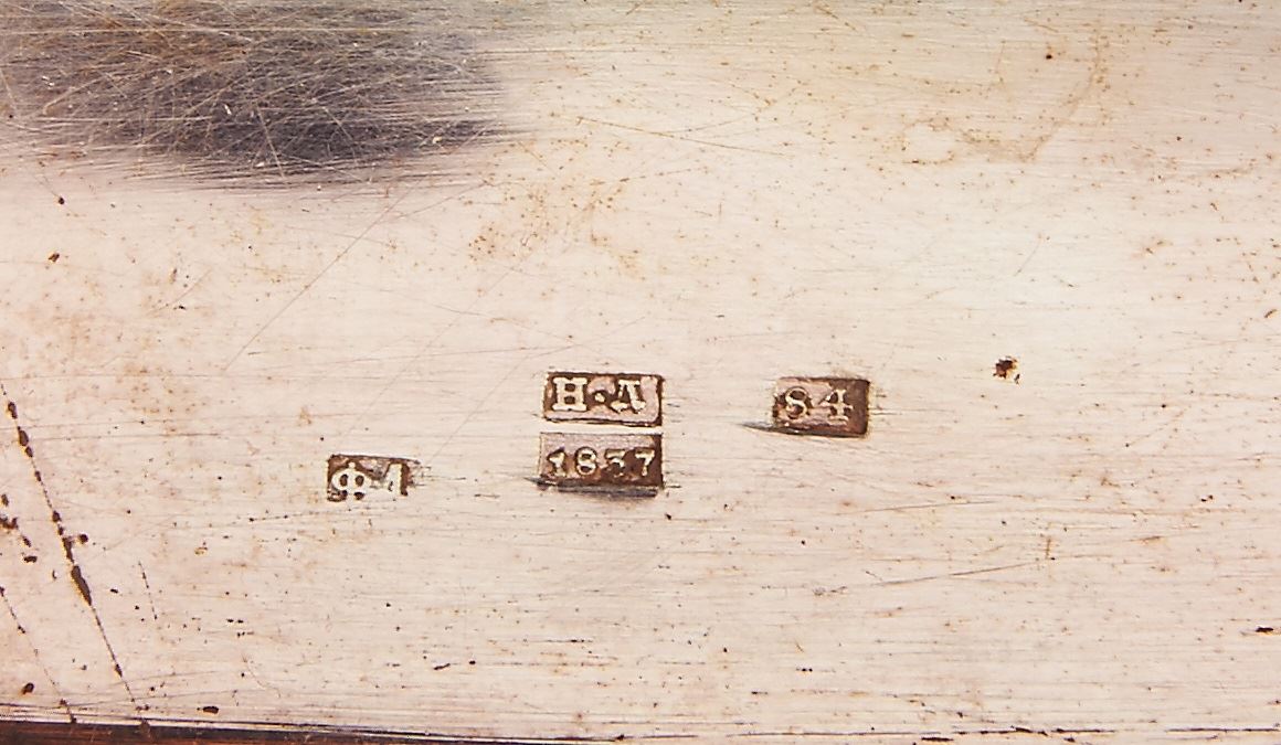 - marca de teor de 84 zlotnicks, marca de ensaiador de Moscovo de Nicholai Bubrovin (1837), marca de ourives Ф.Λ.