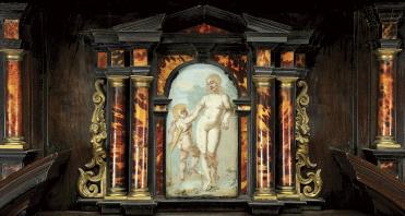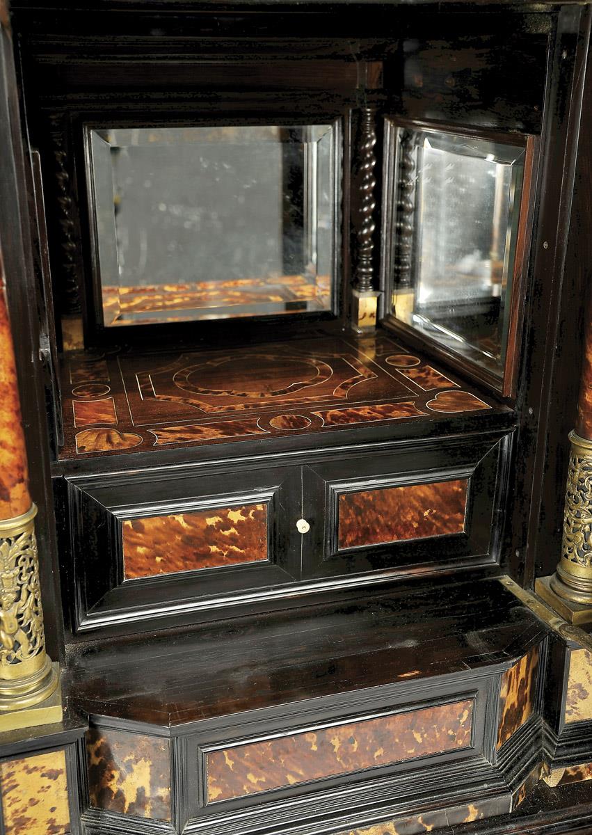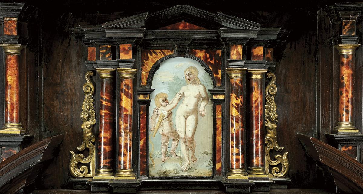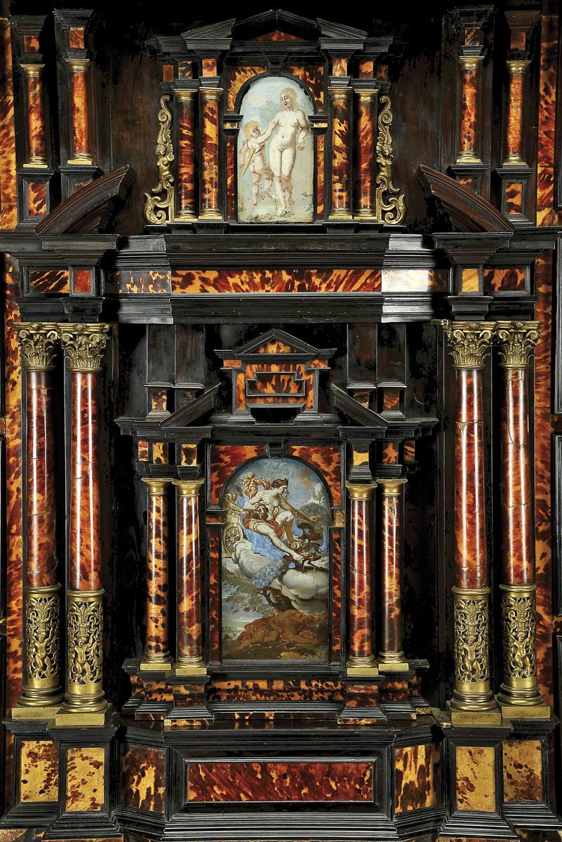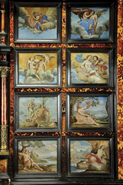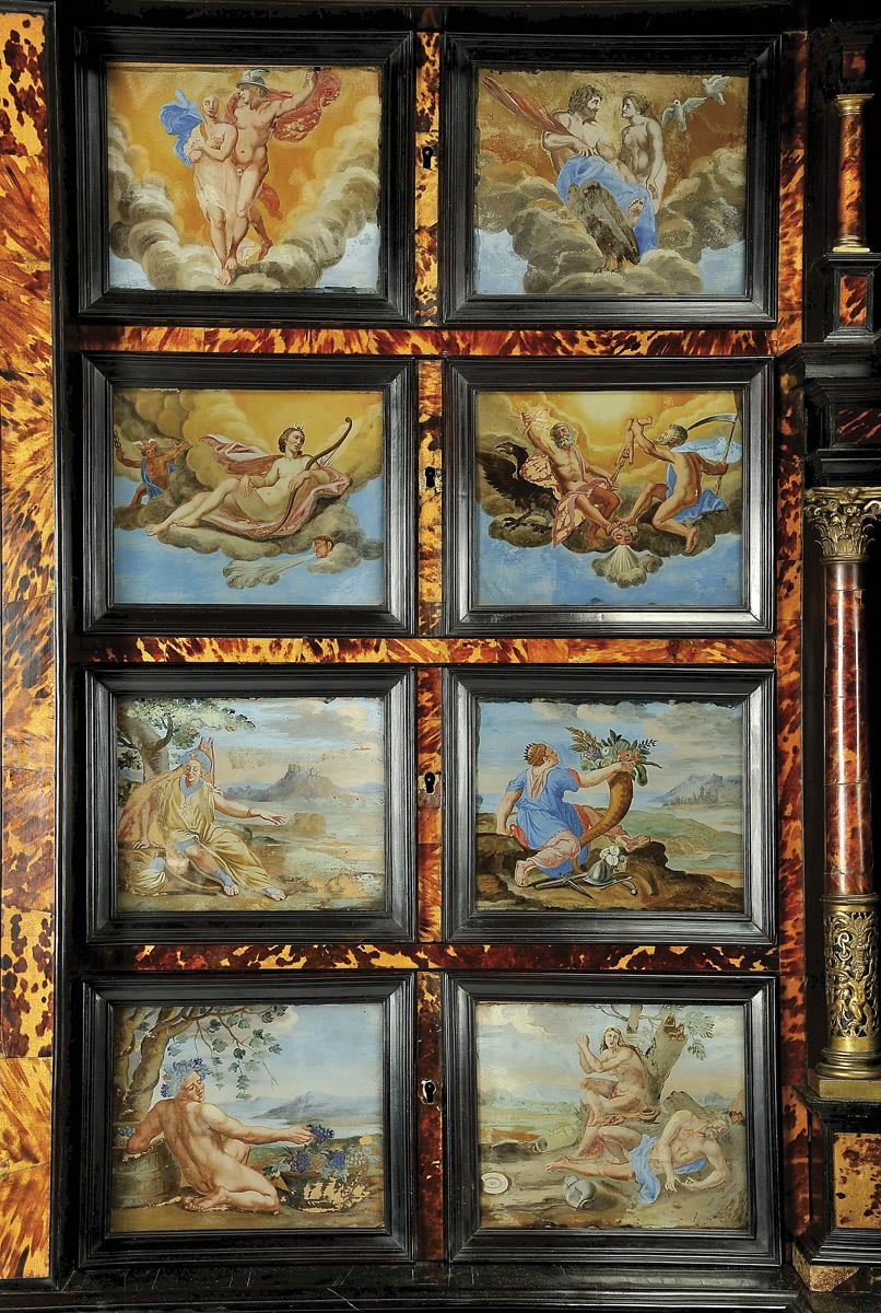 - frentes das gavetas com pinturas «sous-verre» "Cenas mitológicas", interior do nicho central com jogo de espelhos, aplicações em bronze