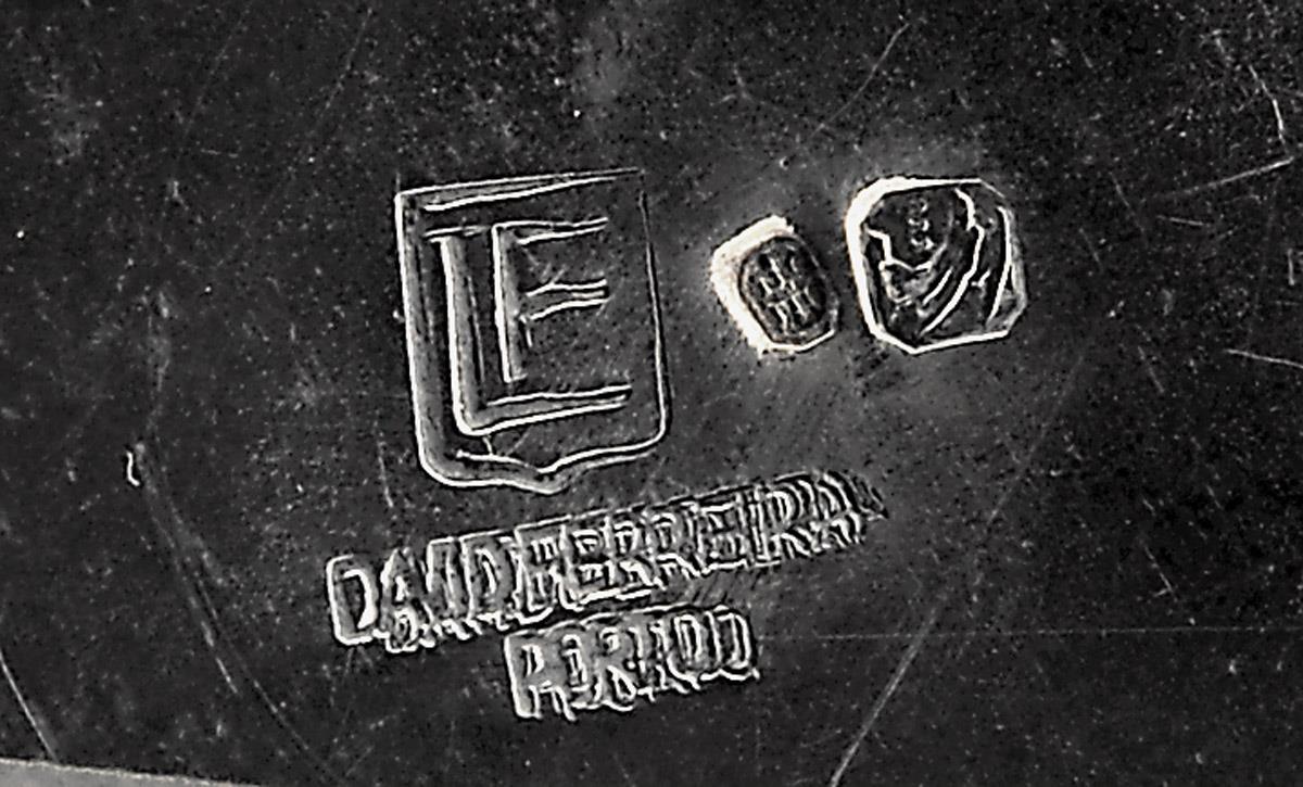 - pegas cravejadas com duas ágatas musgosas em talhe cabochon, contraste Águia do Porto (1938-1984), marca de ourives de Delmar Gomes Pinheiro (1945-1981), marca de LUÍS FERREIRA, marca da casa DAVID FERREIRA - PORTO