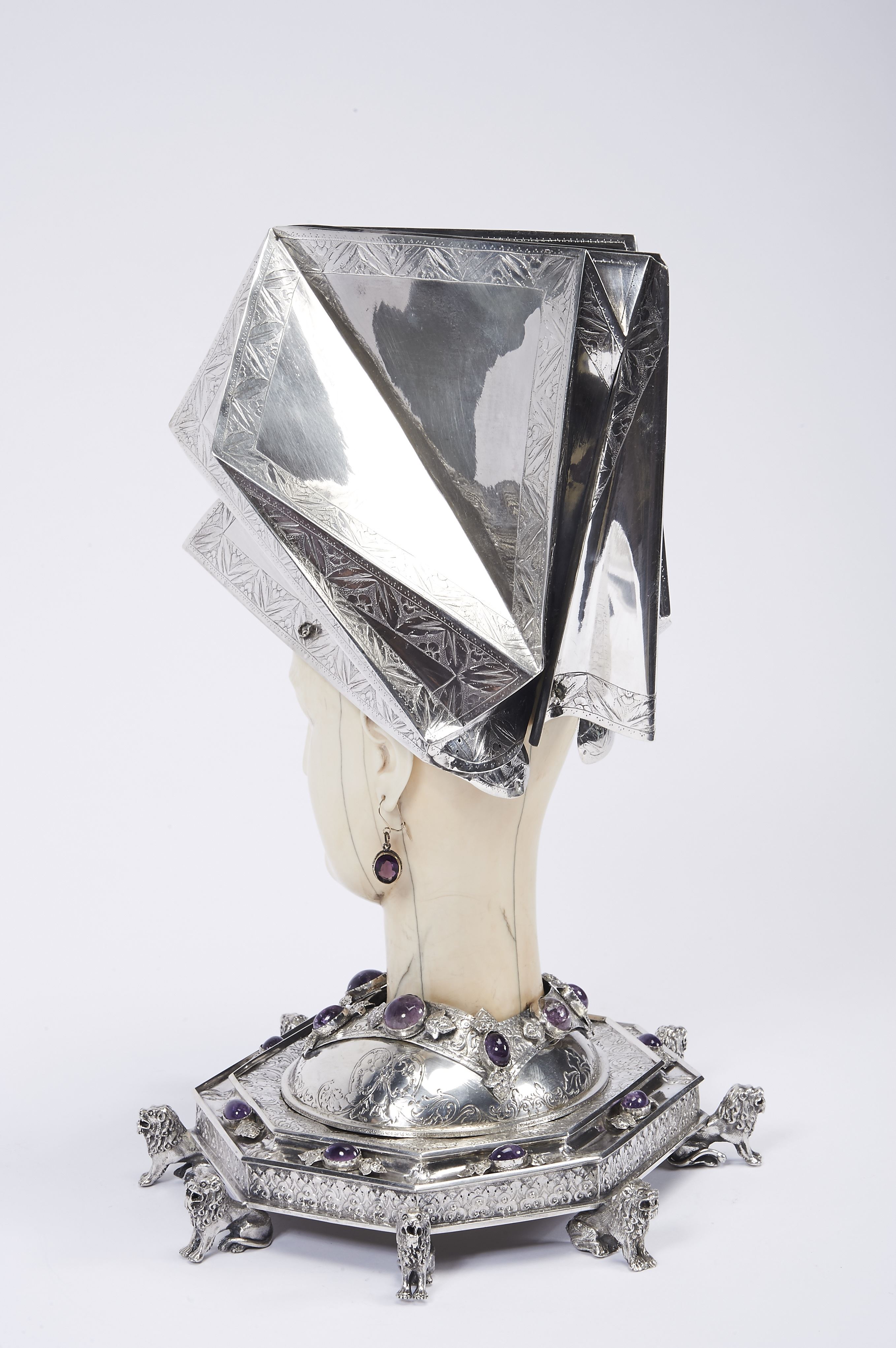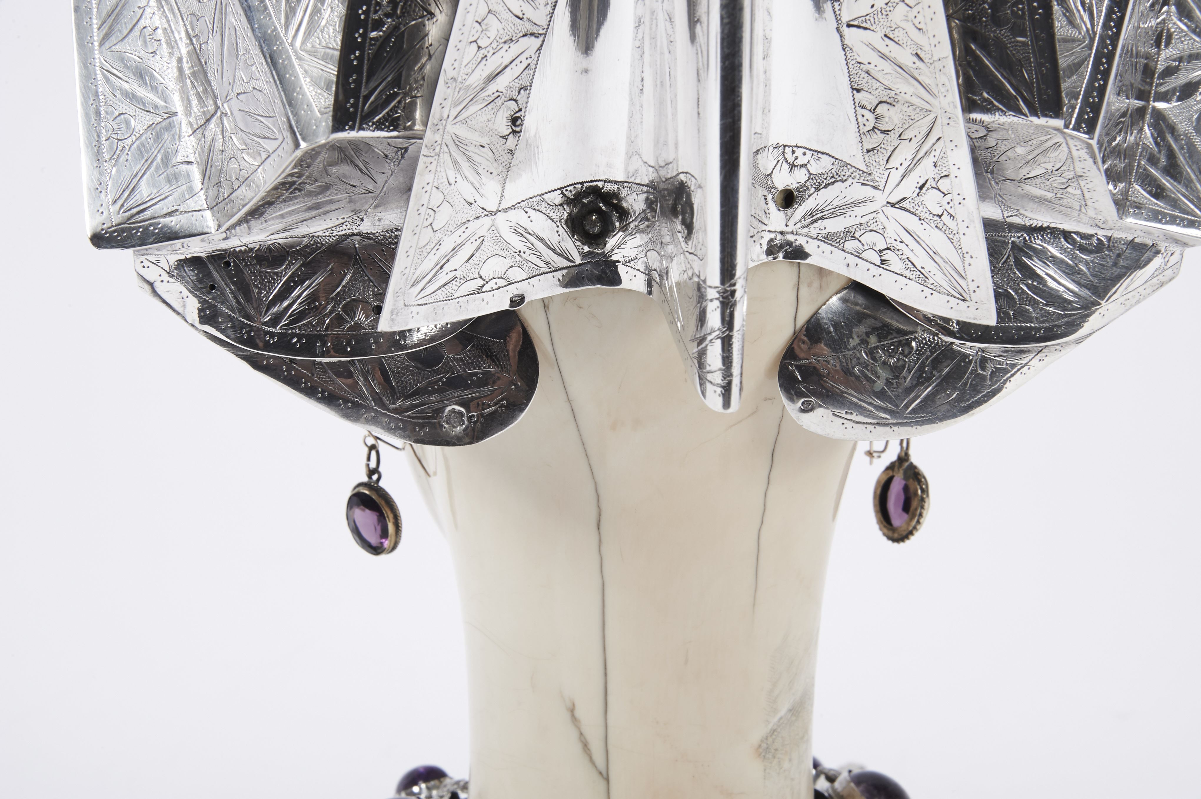 - base e aplicações em prata de 800/1000, aplicação de vidros roxos e ametistas em talhe cabochon