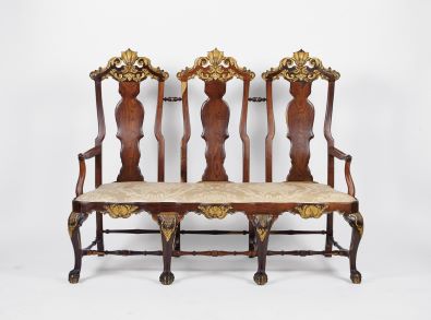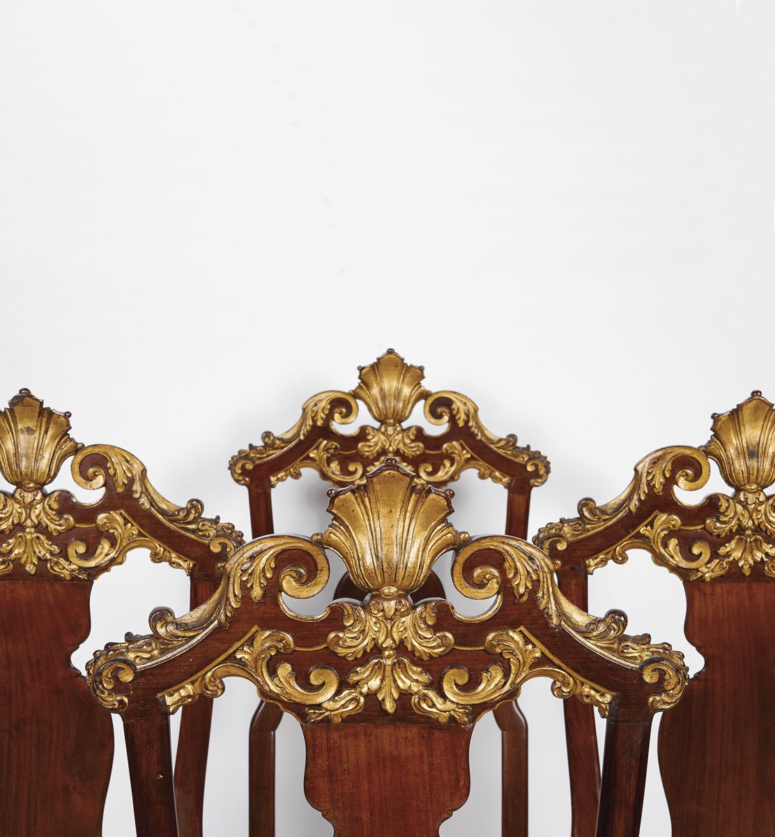 - costas vazadas e recortadas, travessas torneadas, pés de «garra e bola», assentos estofados