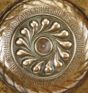 - decoração relevada e gravada, tarja com inscrição em letras góticas