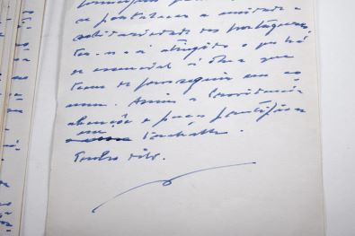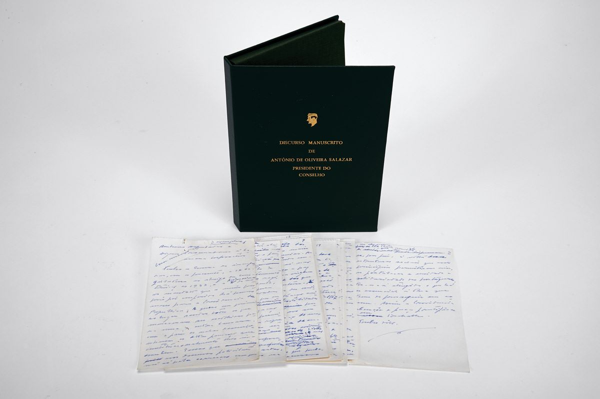 - Manuscrito autógrafo não assinado, constituído por 26 folhas soltas de um bloco de apontamentos, escritas de um só lado (rascunho?), com a indicação “3 exemplares” na primeira folha, provavelmente destinado a ser dactilografado. Discurso proferido na Assembleia Nacional por ocasião da sessão inaugural da IX Legislatura do Estado Novo, que teve início em 25 de Novembro de 1965. O conjunto acondicionado em portfólio revestido a tela verde.