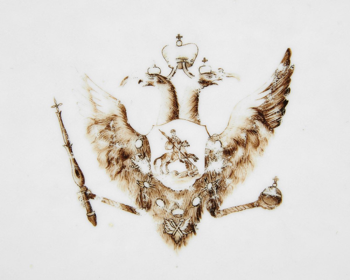 - motivo central com decoração a sépia "Armas Imperiais Russas", aba com decoração policromada "Grinaldas de flores"