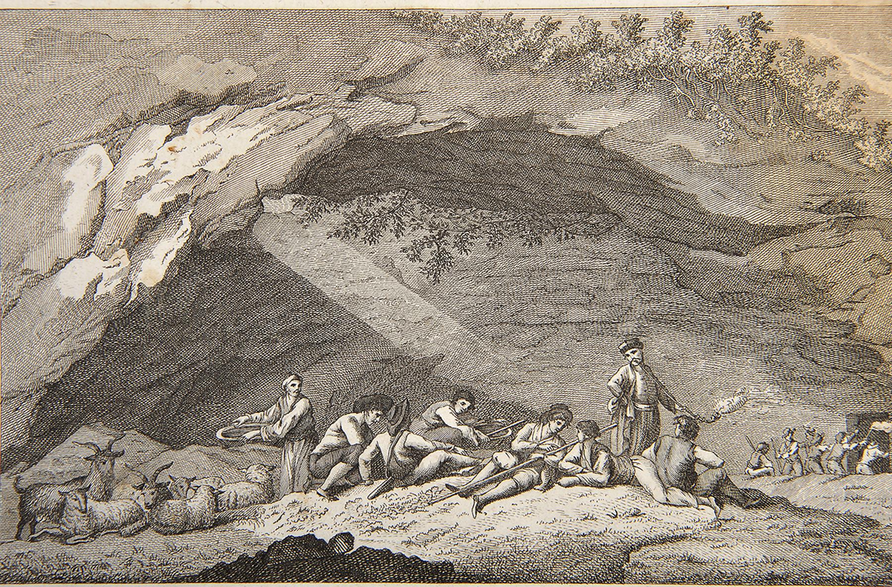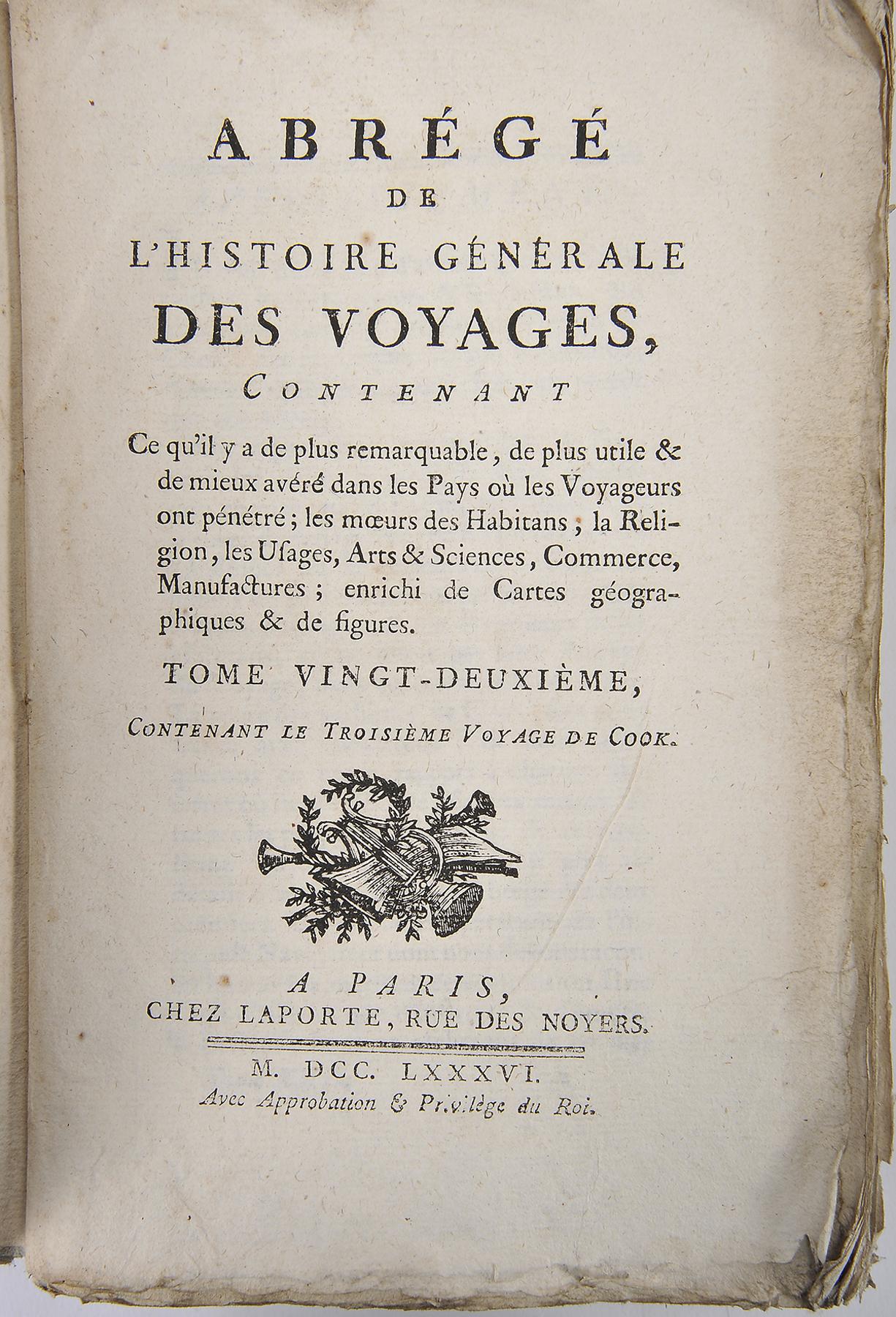 - LA HARPE, Jean-François de.- Abrégé de l'histoire générale des voyages, contenant ce qu'il y a de plus remarquable, de plus utile et de mieux avéré dans les pays où les voyageurs ont pénétré; les mœurs des habitants, la religion, les usages, arts & sciences, commerce, manufactures...- A Paris: Hotel de Thou, 1780-1801.- 32 vols.: il.; 21 cm.- B. Jean-François de La Harpe (1739-1803), pedagogo, crítico literário, escritor e académico francês, foi amigo de Voltaire. A obra, que obteve grande popularidade, é uma compilação de textos de vários autores. Conjunto com falta do atlas, de maior formato, que deveria conter os mapas. Os primeiros 21 tomos incluem 76 gravuras, numeradas de 1 a 82, faltando portanto 6. Os restantes 11 tomos conservam 20 gravuras, das quais 4 são mapas desdobráveis, mas só as primeiras 6 estão numeradas, pelo que a verificação é difícil. No último tomo faltam ainda as seguintes páginas finais dos índices: I a IV e XXV a XLVIII. Algumas manchas no tomo II (de maré) e marginais nos tomos III, XIV, XV e XXVIII. Alguns tomos com margens um pouco empoeiradas e irregulares. Exemplar em brochura, por aparar, revestido de coberturas de papel liso, tal como foi publicado. Brunet, III, col. 771.