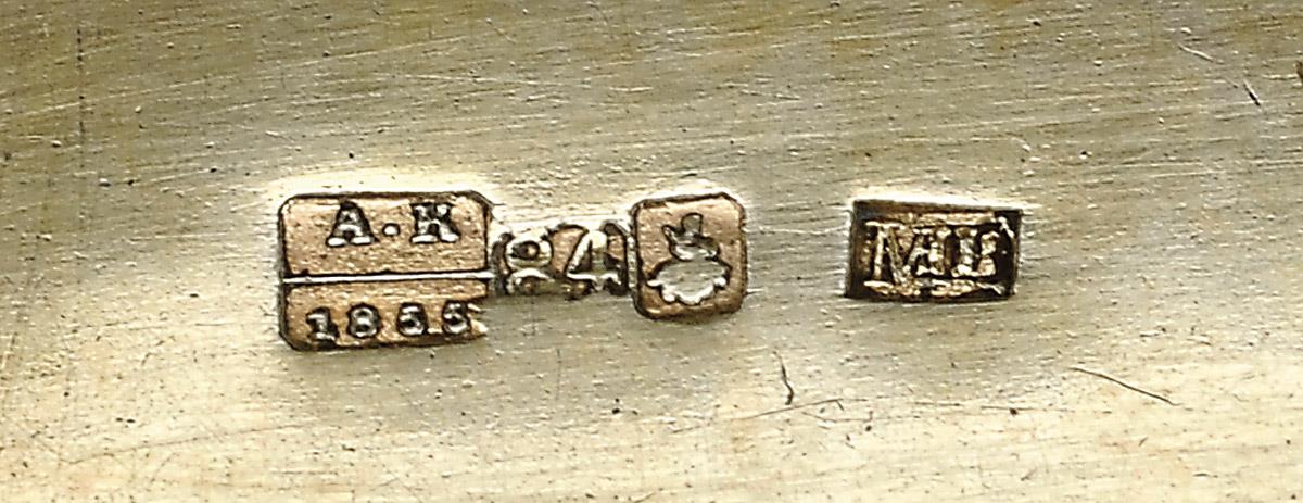 - decoração a niello, marca de teor de 84 zlotnicks, marca do ensaiador da cidade de Moscovo de Andrei Kovalsky (1855), marca de ourives MB(?)