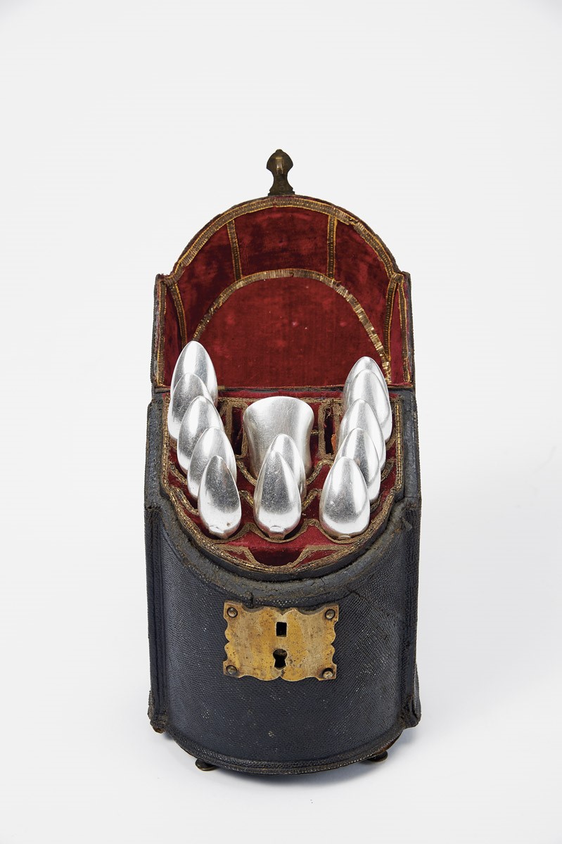 - interior com doze colheres de chá e concha de açúcar, marcas de ensaiador do Porto (1836-1881) e de Guimarães; marcas de ourives IRP (1836-1867); de Joaquim Martins Pimenta (1870-1886) e MIV