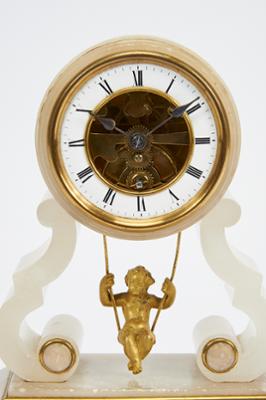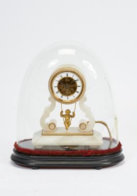 - mostrador com aro em esmalte branco e centro vazado permitindo observar o mecanismo, autonomia de um dia, pêndulo em bronze dourado "Amor em baloiço", base em madeira, redoma de vidro
