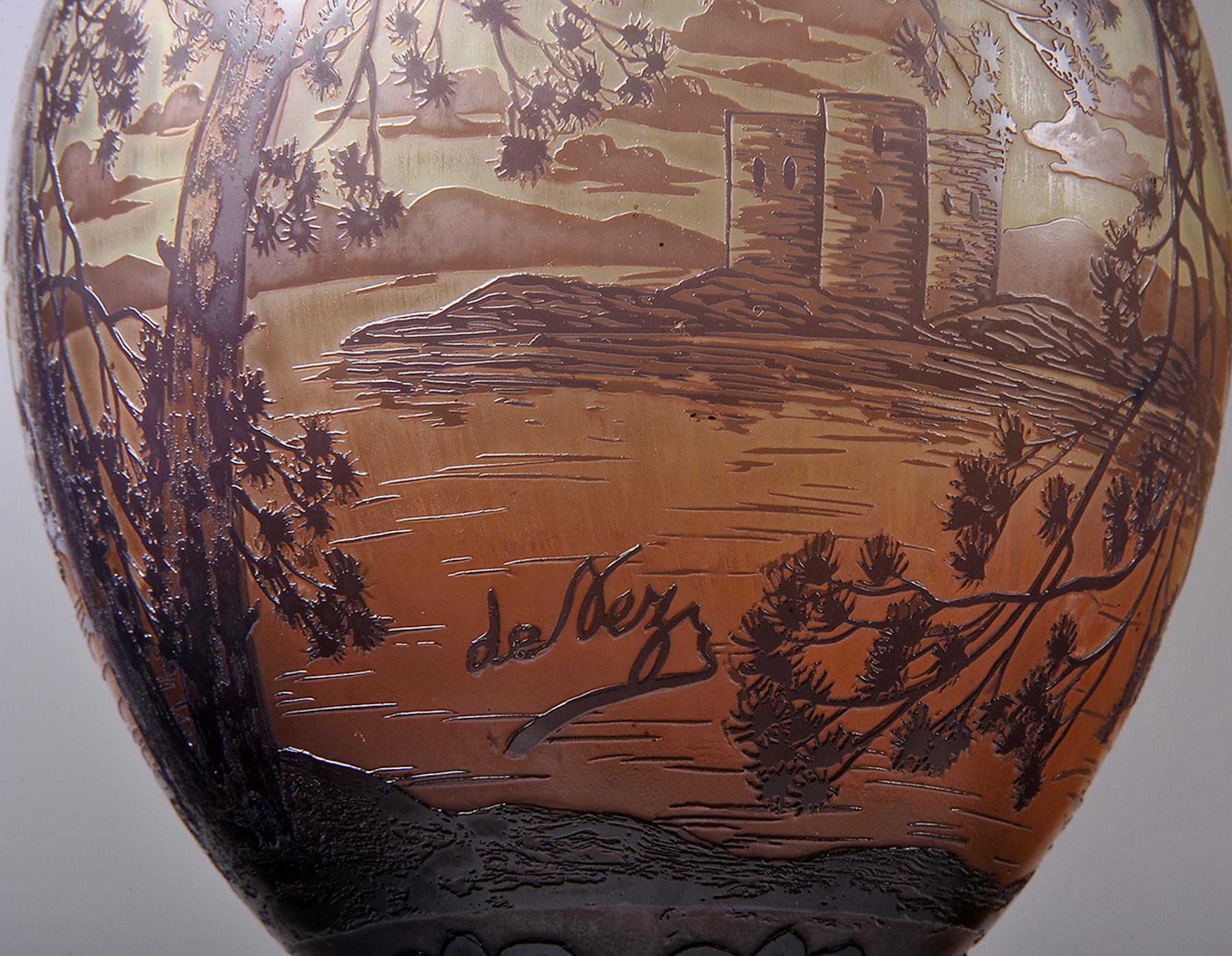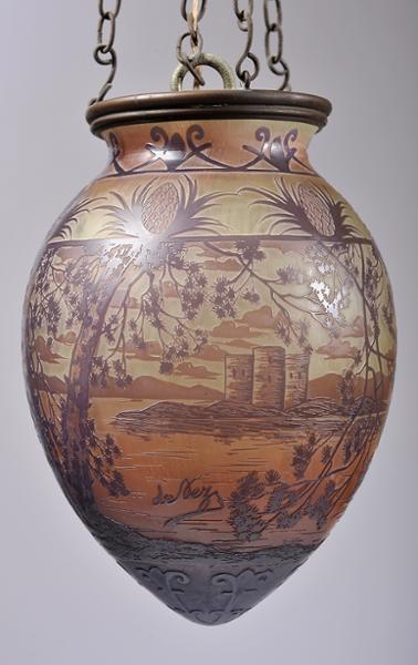 - globo em pasta de vidro relevada, decoração a negro e laranja "Paisagem com rio e castelo"