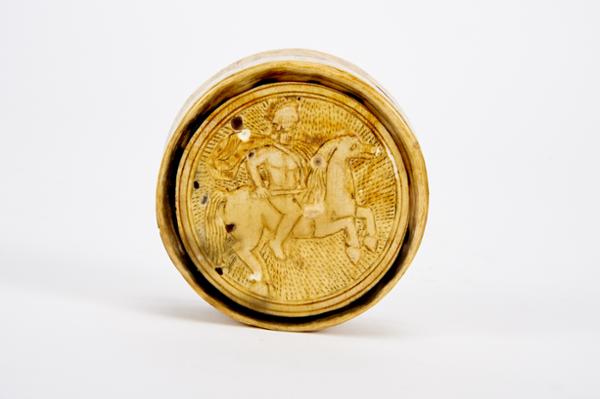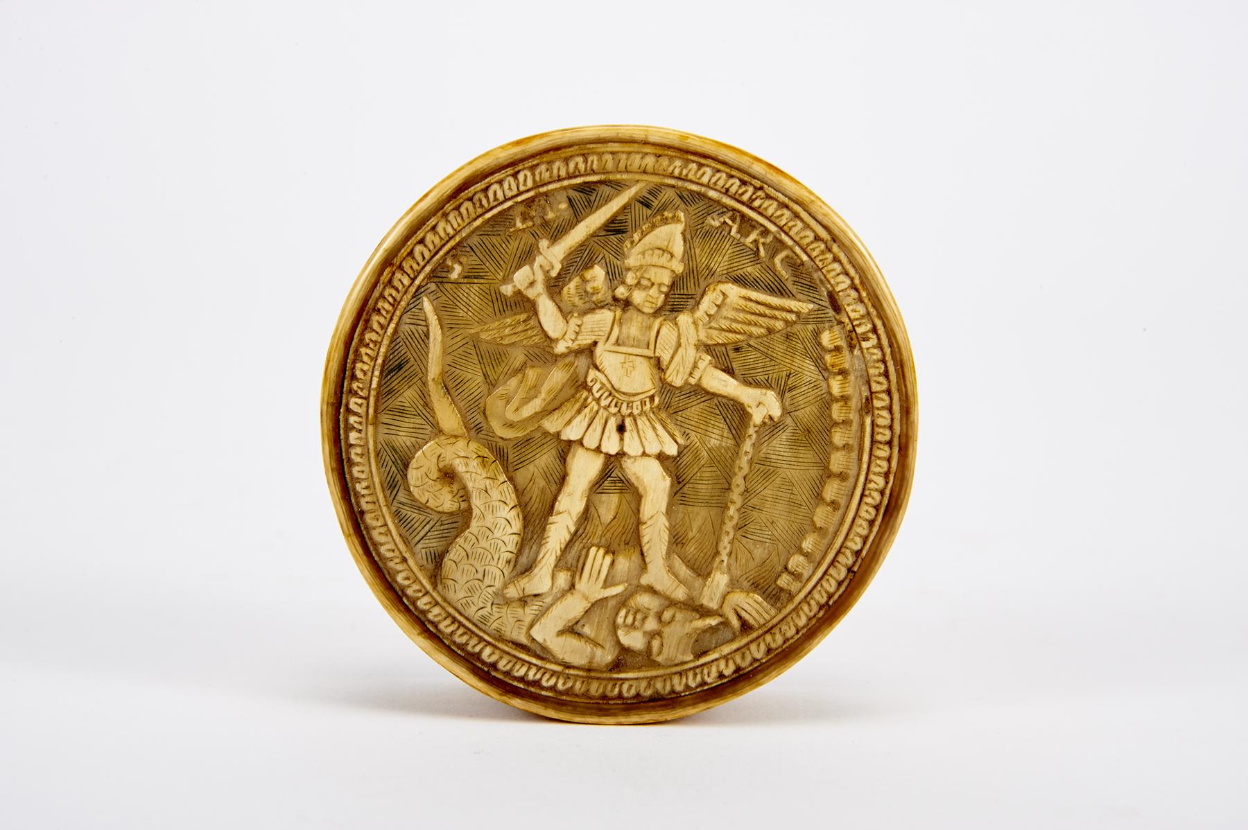 - decoração esculpida "São Miguel Arcanjo", verso relevado "Figura a cavalo"