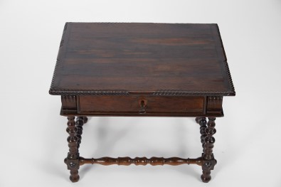 - bordo do tampo «tremido», pernas e travejamento torneados, entrada da chave em vinhático